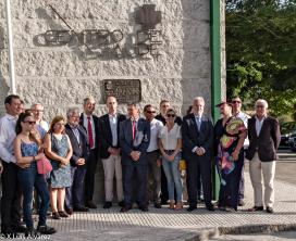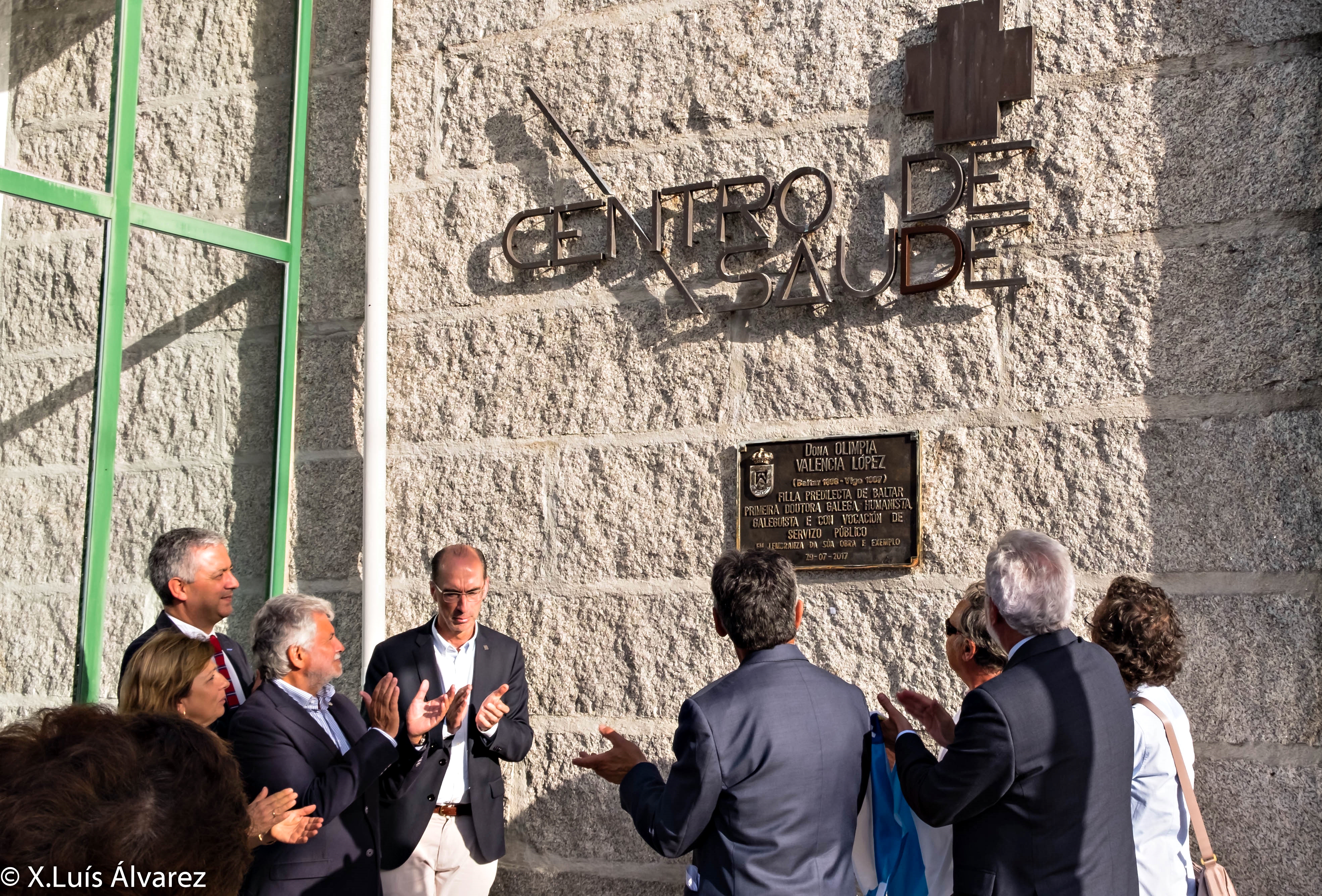 - O conselleiro de Sanidade e o secretario xeral de Política Lingüística na descuberta da placa conmemorativa no Centro de Saúde de Baltar (Ourense), concello de nacemento da médica galeguista Olimpia Valencia