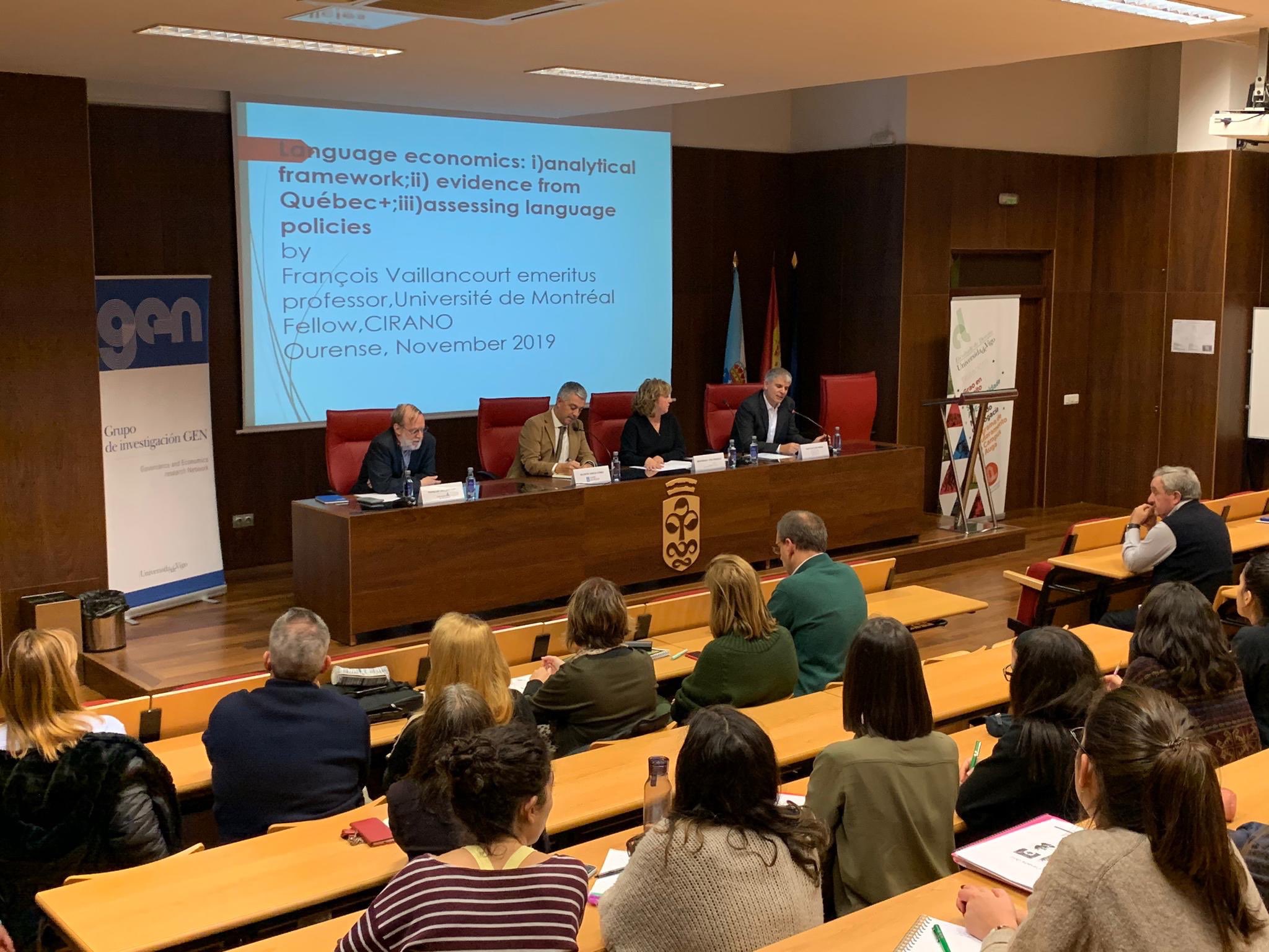 VolverOurense, 4 de novembro de 2019.- O secretario xeral de Política Lingüística, Valentín García, asistiu hoxe á tarde á conferencia "40 anos de políticas lingüisticas no Quebec. 1977-2017" que impartiu o profesor François Vaillancourt na Aula Magna da Facultade de Dereito da Universidade de Vigo no Campus de Ourense.