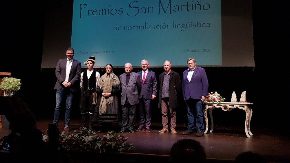 VolverA Estrada (Pontevedra), 13 de novembro de 2019.- O Teatro Principal estradense acolleu hoxe ao serán a entrega da XXIX edición dos Premios San Martiño de Normalización Lingüística, uns galardóns outorgados polo Padroado dos Premios San Martiño que destacan o labor que diversas persoas e colectivos realizan a prol da difusión e promoción da lingua galega. Recibíronos a Asociación Cultural Tamparrantán, na categoría A Estrada e Comarca de Terra de Montes; a xornalista e escritora Ana Cabaleiro Brión, na categoría Galicia enteira, e o Museo do Pobo Galego, na categoría Toda unha vida. Recibiron cadansúa escultura de Manolo Vilaverde. No acto participaron o secretario xeral de Política Lingüística, Valentín García e o alcalde, José C. López, nun acto no que Oli Xiráldez e Gustavo Couto interpretaron varios cantares de cego recollidos da nosa tradición oral.