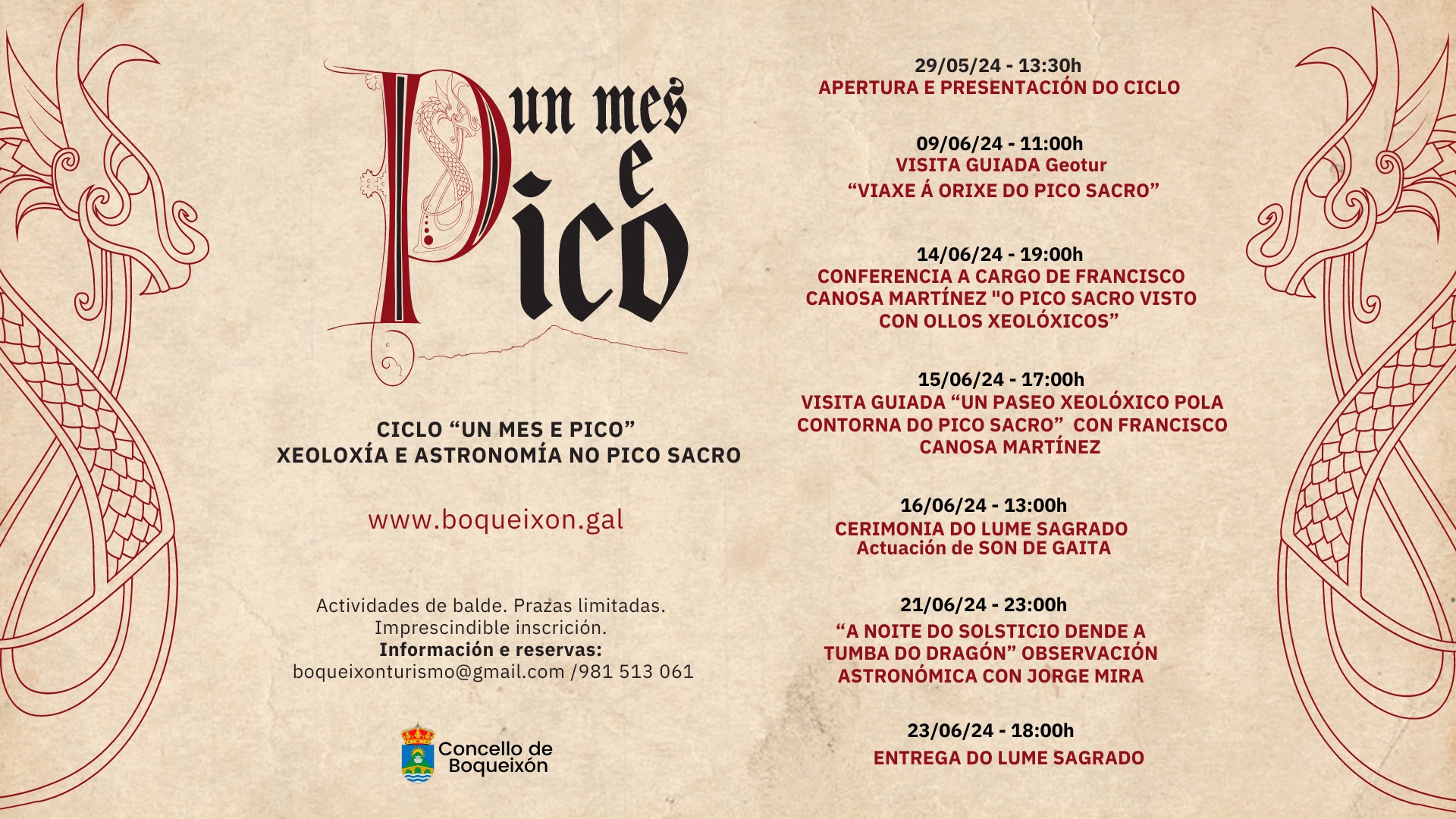 O programa en 2024 inclúe, entre outros, a conferencia "O Pico Sacro visto con ollos xeolóxicos", a cargo de Francisco Canosa Martínez, quen conducirá tamén a visita guiada titulada "Un paseo xeolóxico pola contorna do Pico Sacro", unha observación astronómica con Jorge Mira baixo o lema "A noite do solsticio dende a tumba do dragón" ou o evento "Cerimonia do lume sagrado", coa actuación de Son de Gaita.