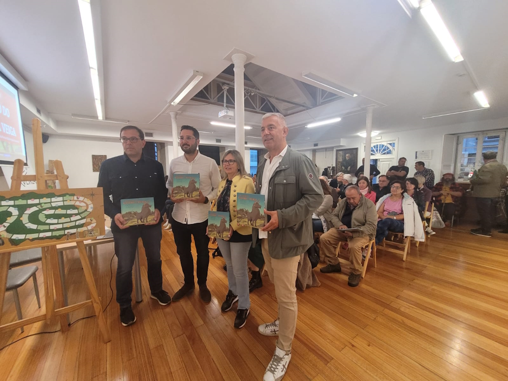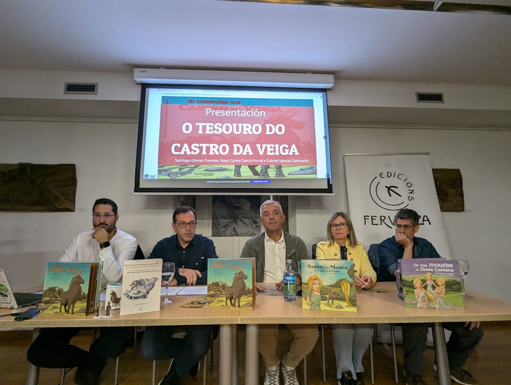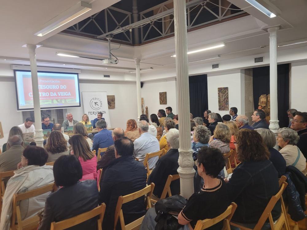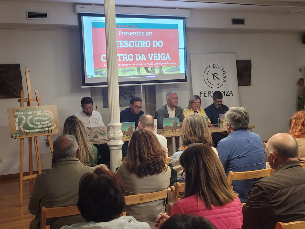 Lalín (Pontevedra), 12 de setembro de 2024.- O secretario xeral da Lingua, Valentín García, acompañou a Santiago Gómez Fuentes, Xoán Carlos García Porral e Gabriel Iglesias Sanmartín na presentación do libro O tesouro do Castro da Veiga, cuxa edición apoia a Consellería de Cultura, Lingua e Xuventude. O acto celebrouse no Museo Ramón María Aller.