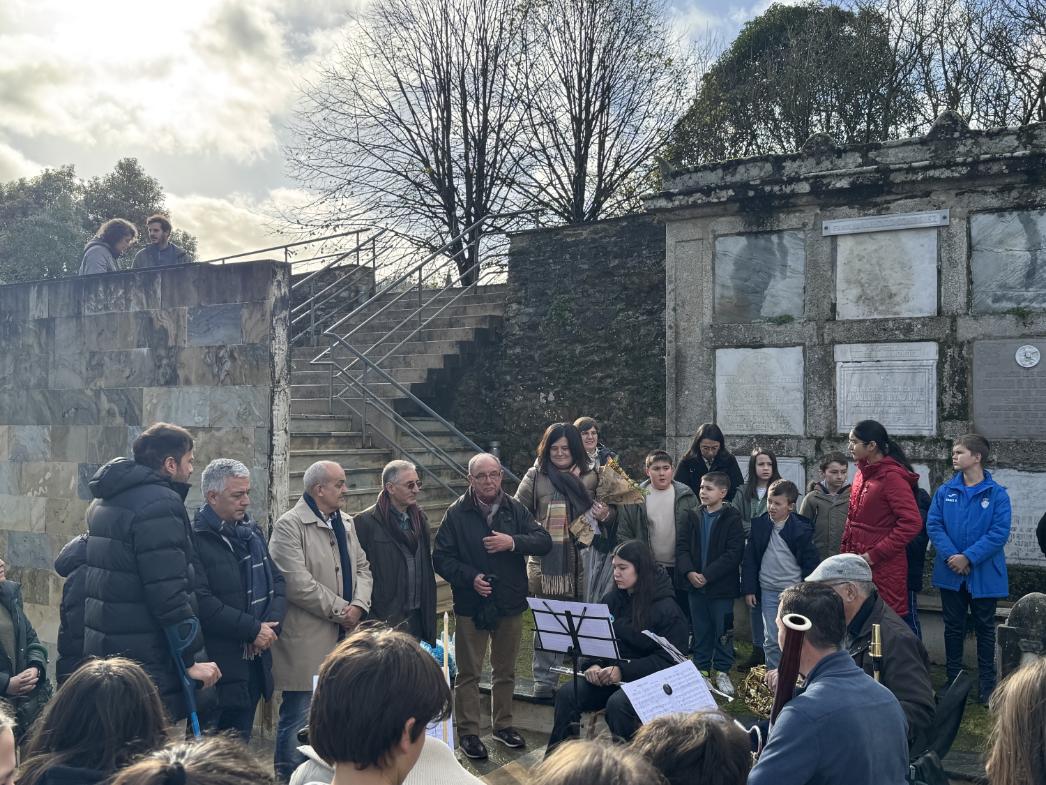 Mondoñedo, 19 de decembro de 2024.- O secretario xeral da Lingua, Valentín García, participou hoxe na ofrenda floral no panteón de Pascual Veiga, autor da música do Himno de Galicia, no cemiterio vello de Mondoñedo, no marco doa actos conmemorativos do Himno galego.