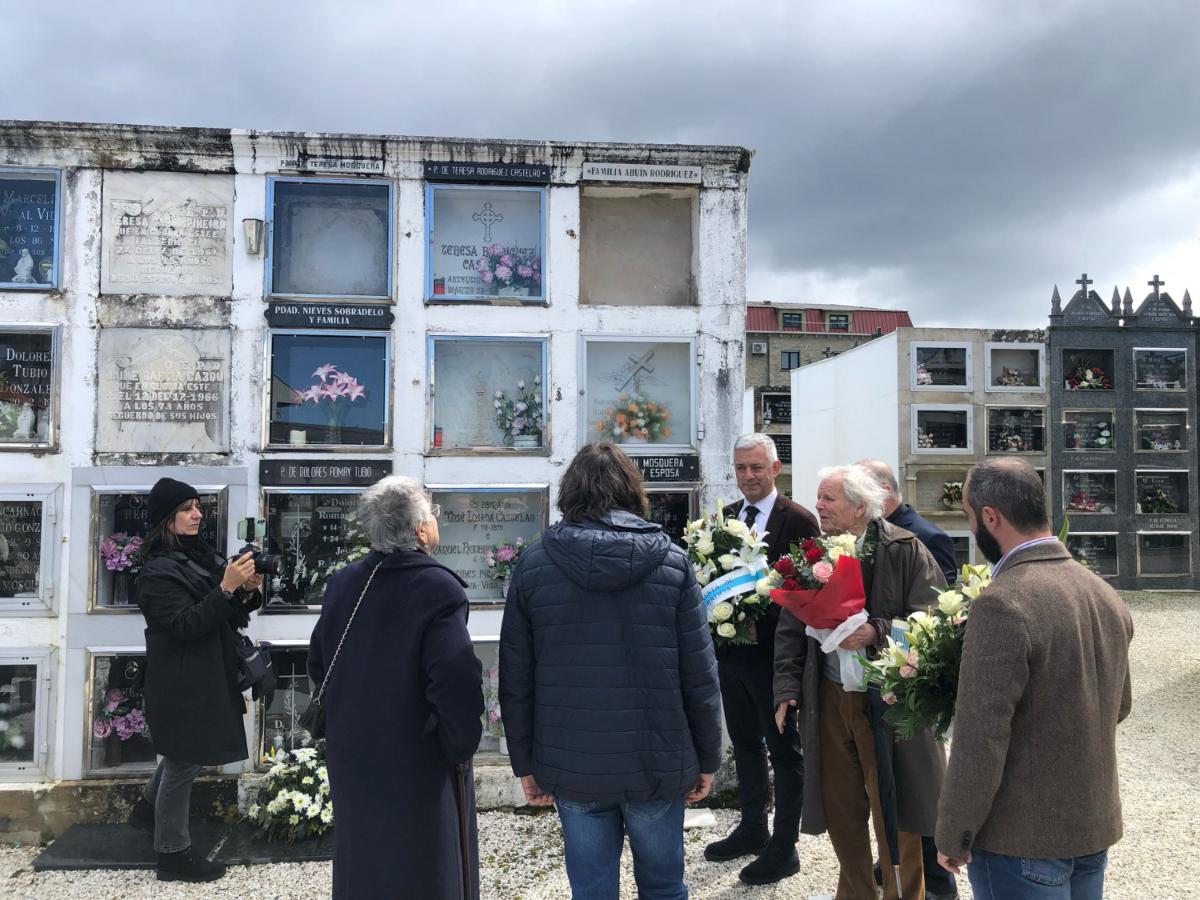 Rianxo (A Coruña), 23 de marzo de 2025.- O secretario xeral da Lingua, Valentín García, participou na homenaxe a Teresa Rodríguez Castelao, irmá de Afonso Daniel, organizada polo Partido Galeguista co gallo do 25º aniversario do seu pasamento. A homenaxe, consistente nun oficio relixioso que acolleu a igrexa de Santa Comba e nunha ofrenda floral na sepultura na que Teresa repousa canda a outra irmá, Josefina, no camposanto rianxeiro. Os actos foron organizados polo Partido Galeguista no marco da celebración do Ano Castelao e neles participaron tamén canda García Gomez o secretario xeral do Partido Galeguista, Francisco López; o alcalde de Rianxo, Julián Bustelo; o herdeiro de Afonso Daniel Rodríguez Castelao, Javier Baltar, e o párroco Marcelino Sánchez.