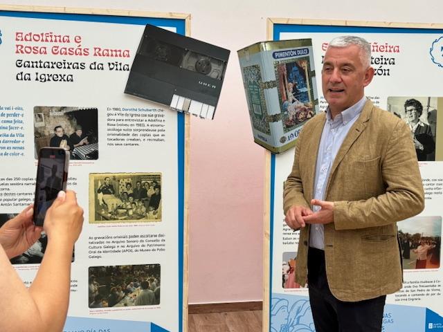 Muxía (A Coruña), 24 de xuño de 2025.- O secretario xeral da Lingua, Valentín García, inaugurou hoxe ao mediodía na Sala Gervasio Sar a mostra Cantade todas a unha. O cantigueiro popular galego, conmemorativa das Letras Galegas 2025.