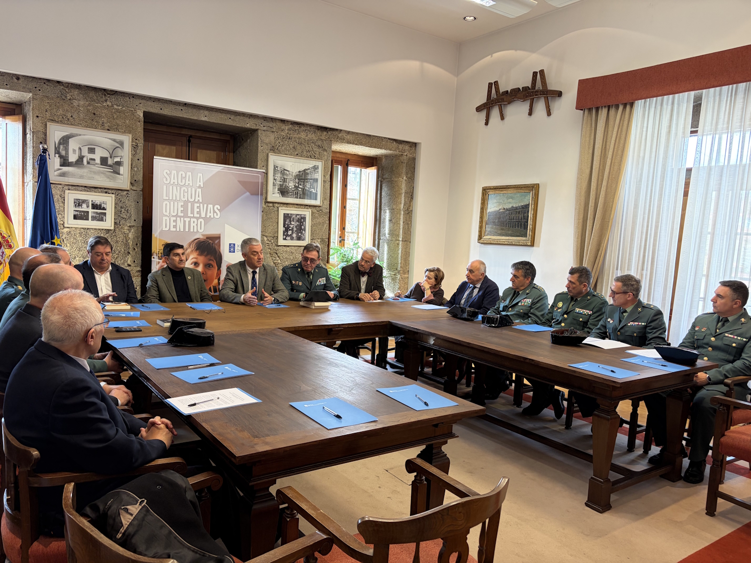 VolverSantiago de Compostela, 10 de marzo de 2026.- A Xunta de Galicia, a través da Secretaría Xeral da Lingua, e mais a Irmandade Xurídica Galega avanzan para asinar o primeiro grande acordo de promoción do uso do galego cos corpos de seguridade do Estado. O secretario xeral da Lingua, Valentín García, mantivo un encontro hoxe con responsables da Garda Civil en Galicia e con representantes da Administración estatal e profesionais do ámbito da xustiza, para ver as posibles vías de colaboración que redunden nun maior uso do galego por parte da Garda Civil. A reunión encádrase na rolda de contactos de recollida de achegas ao novo Plan xeral de normalización da lingua galega. Participaron nela ademais de Valentín García, o presidente da Irmandade Xurídica Galega, Xaquín Monteagudo; o presidente da Asociación de Funcionarios e Funcionarias pola Normalización Lingüística, Xosé González; o delegado do Goberno en Galicia, Pedro Blanco; a avogada do Estado-Xefe en Galicia, Consuelo Castro; o subdelegado do Goberno na Coruña, Julio Abalde; o xeneral xefe da Zona da Garda Civil de Galicia, Miguel Ángel González; o coronel xefe da Comandancia da Garda Civil da Coruña, Fernando Pedreira; o coronel xefe da Comandancia da Garda Civil de Lugo, Luís Germán Avilés; o tenente coronel xefe da Comandancia da Garda Civil de Ourense, Rafael Berguillo; o tenente coronel xefe accidental da Comandancia da Garda Civil de Pontevedra, Óscar Grañas; o tenente coronel xefe interino do Sector de Tráfico da Garda Civil de Galicia, Antonio Hidalgo; o comandante xefe da Compañía da Garda Civil de Santiago, Francisco Antonio Torres; a maxistrada Paz Filgueira e o académico da lingua e coordinador da actualización do Plan xeral de normalización da lingua galega, Manuel González.