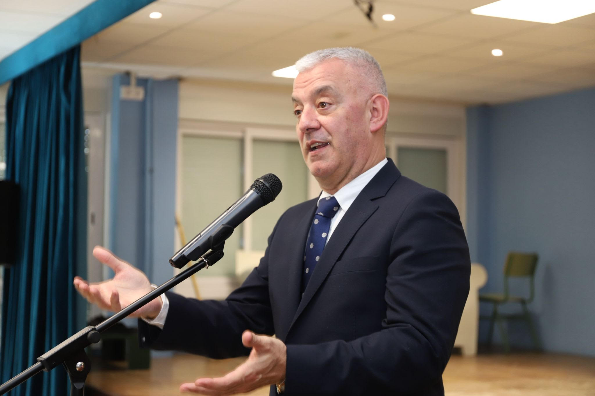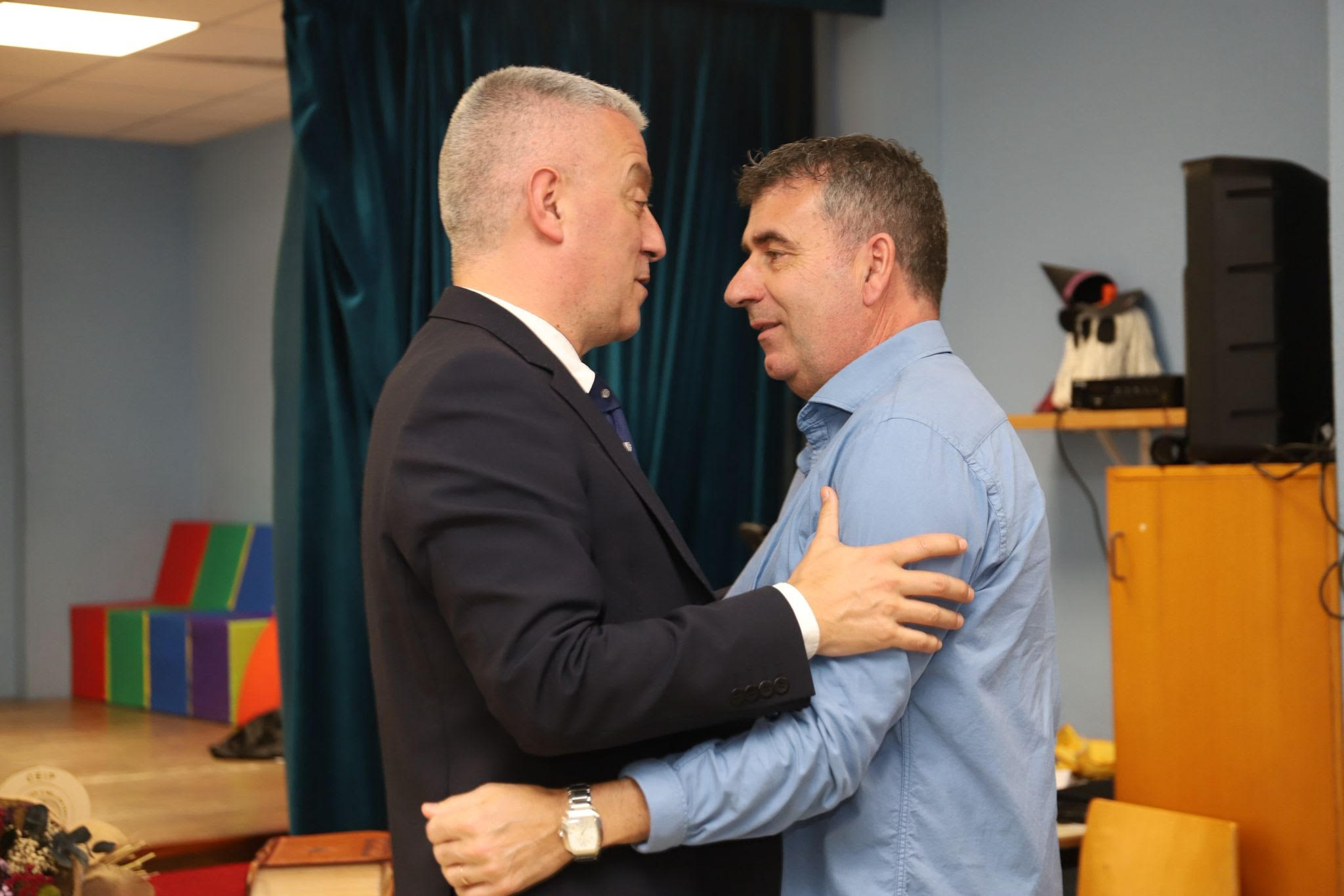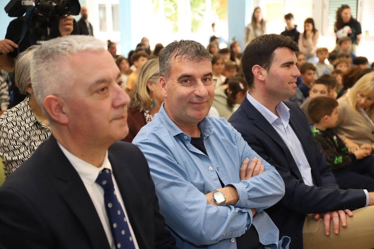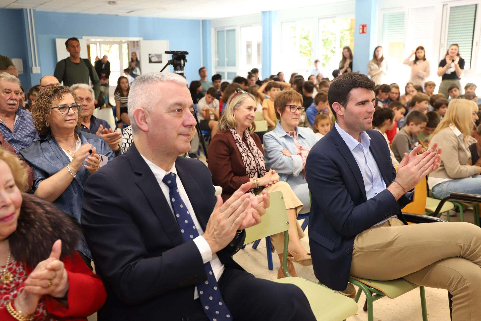 A Estrada (Pontevedra), 24 de abril de 2026.- O secretario xeral da Lingua, Valentín García, acompañou hoxe a Xosé Luna Sanmartín no acto de homenaxe celebrado no CEIP do Foxo con motivo da xubilación do mestre e escritor.