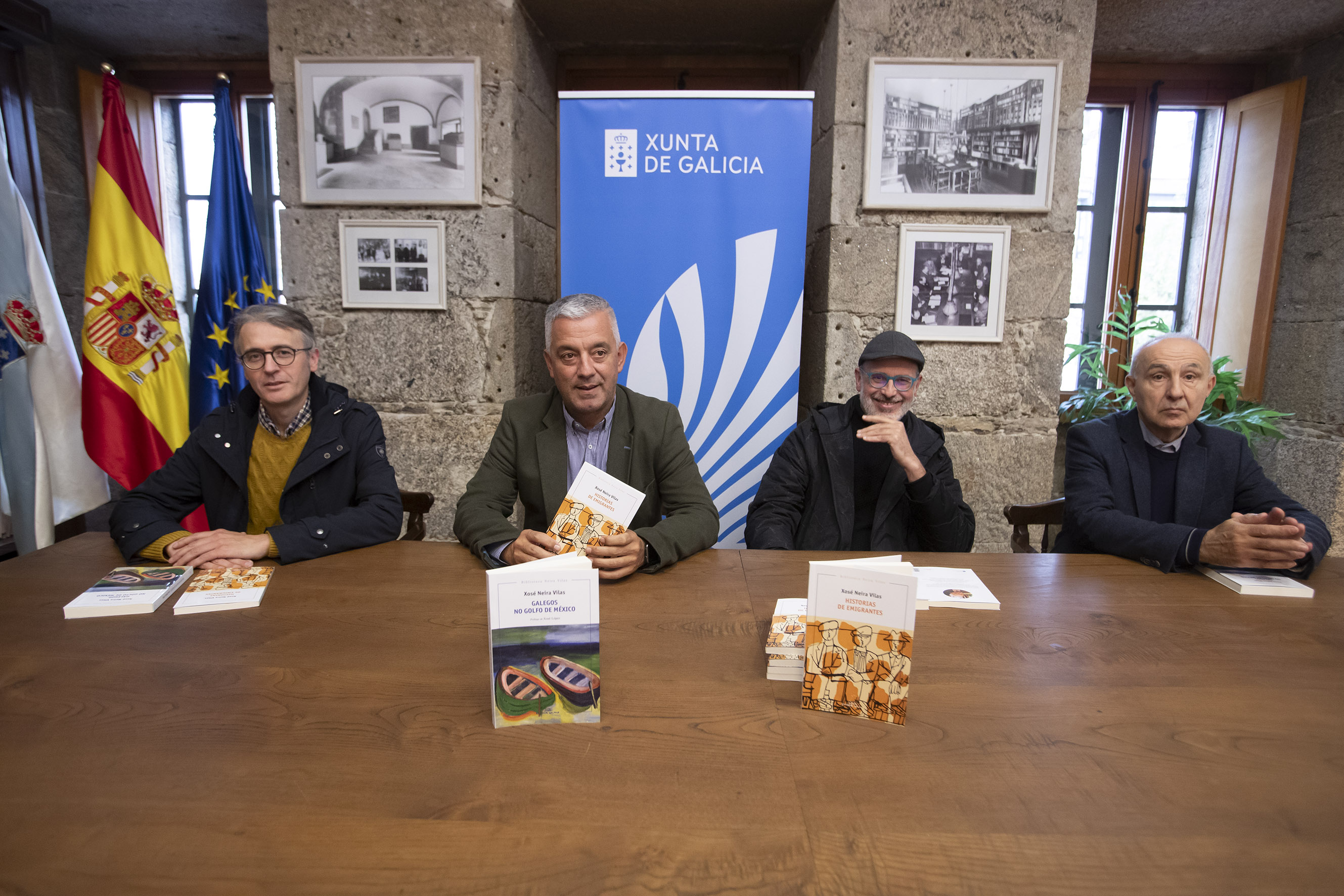 Canda Valentín García tamén participaron neste acto Marcos Calveiro, director de Edicións de Editorial Galaxia; Fernando Redondo Neira, presidente da Fundación Xosé Neira Vilas, e Xosé López García, prologuista de Galegos no Golfo de México.