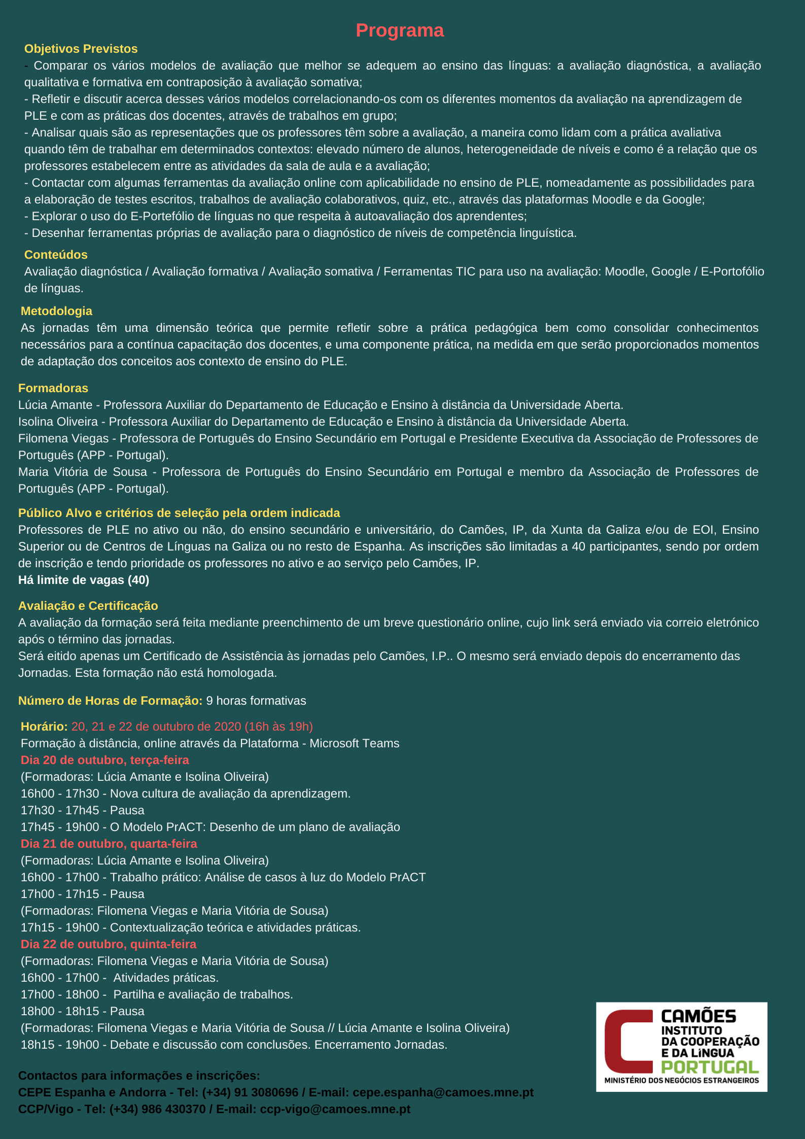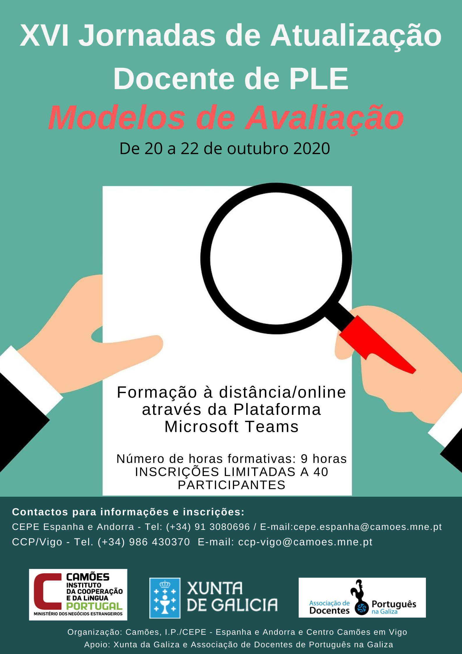 O Camões, Instituto da Cooperação e da Língua, I.P., a través da Coordenação do Ensino Português em Espanha e Andorra e do Centro Cultural Português en Vigo, organiza a XVI edición das súas xornadas de actualización didáctica para profesorado de Portugués Lingua Estranxeira, que este ano versarán sobre modelos de avaliación.