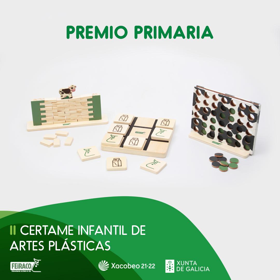 2. Premio Primaria (7-12 anos): un pack de tres xogos fabricados en madeira polos mesmos artesáns, un lote de libros cedido pola Secretaría Xeral de Política Lingüística e un lote de produtos Feiraco.