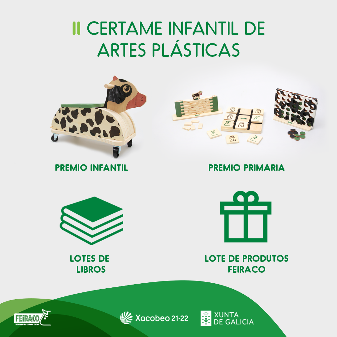1. Premio Infantil (3-6 anos): Un carricoche de vaquiña fabricado polos artesáns galegos de produtos en madeira propietarios da empresa WOOW Juguetes y Deco, un lote de libros cedido pola Secretaría Xeral de Política Lingüística e un lote de produtos Feiraco.