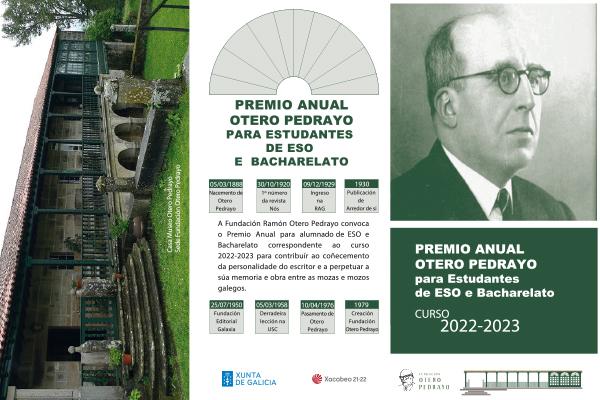 A Fundación Ramón Otero Pedrayo, co apoio da Secretaría Xeral de Política Lingüística, convoca o Premio Anual para alumnado de ESO e bacharelato correspondente ao curso 2022-2023 para contribuír ao coñecemento da personalidade do escritor e a perpetuar a súa memoria e obra entre as mozas e mozos galegos.