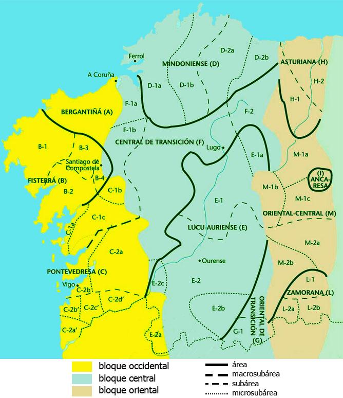 Como ocorre con todas as linguas vivas, o galego posúe variedades formais de natureza territorial. Con todo, a galega é unha lingua de notable homoxeneidade no que se refire ás variedades territoriais que ofrece, razón pola que os especialistas descartan referirse a elas co termo de dialecto. Por tal motivo, nun intento de clasificalas, agrupáronse as diferentes variedades territoriais en tres bloques de fenómenos lingüísticos, dentro dos cales se identifican, asemade, distintas áreas. Para levar adiante este traballo de caracterización e clasificación, botouse man, basicamente, de trazos fonéticos e morfolóxicos, e, en moita menor medida, dos de índole sintáctica ou léxica.