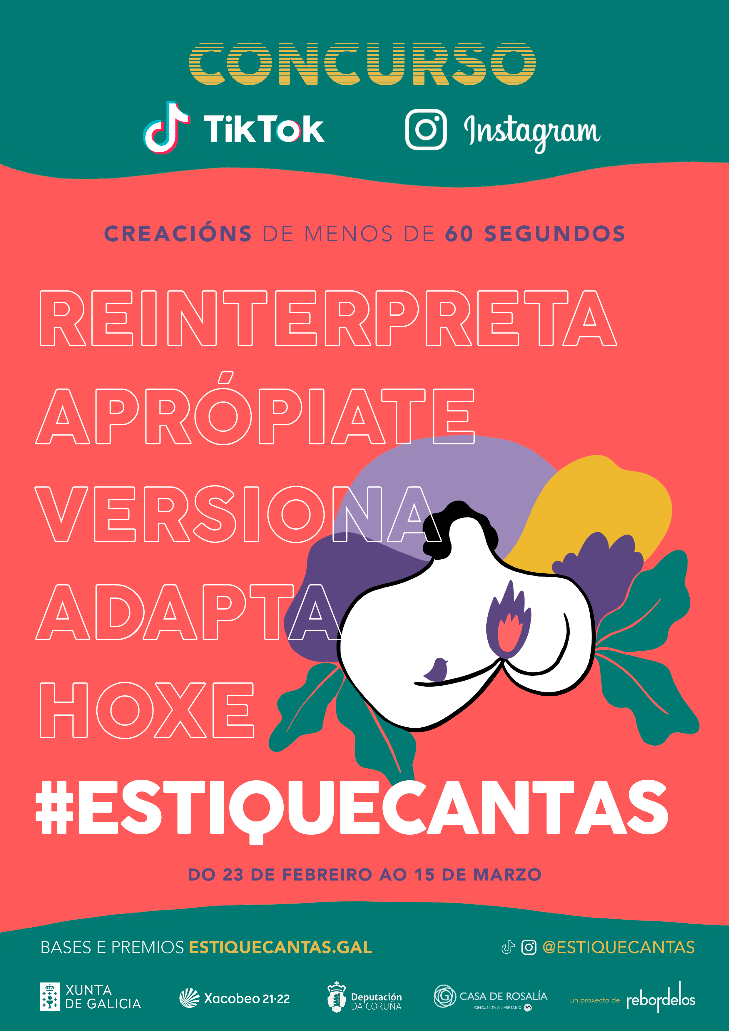 Rebordelos, en colaboración coa Secretaría Xeral de Política Lingüística,a Casa de Rosalía e a Deputación da Coruña, convoca o concurso #Estiquecantas para promover a creación de vídeos breves nas redes sociais inspirados na obra en galego de Rosalía de Castro.