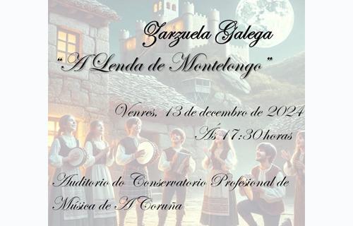 O vindeiro venres 13 de decembro, ás 17.30 h, representarase no Auditorio do CMUS da Coruña A lenda de Montelongo, unha zarzuela galega composta sobre o libreto de Manuel Rey Posse e Juan Buhigas Olavarrieta con música de Bernardo del Río. A Banda do Conservatorio Profesional de Música, dirixida polo profesor Nilo Jesús García Armas, será a responsable da interpretación musical. A dirección e coordinación de escena correrá a cargo de María José Ladra.