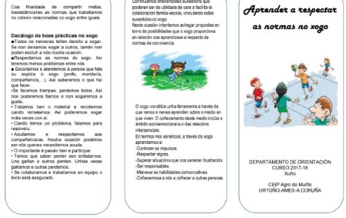 O EDLG e o Departamento de Orientación do CEIP Agro do Muíño de Ames deseñaron este tríptico que inclúe as dez principais normas que cómpre respectar á hora de xogar.