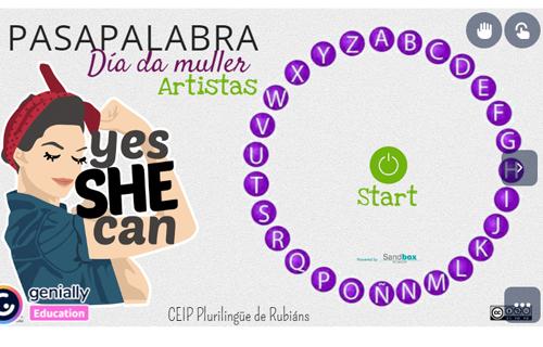 O EDLG do CEIP de Rubiáns proponnos este xogo para descubrir unha chea de mulleres artistas de todo o mundo, consciente de que, para evitar a violencia contra as mulleres, é importante empezar por darlles visibilidade aos seus logros.