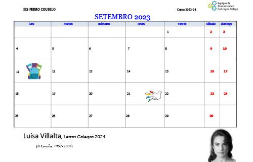 O EDLG do IES Ferro Couselo achéganos un calendario de parede dedicado a Luisa Villalta, autora á que se lle dedica o Día das Letras Galegas de 2024. Nel fan referencia tamén ás datas sinaladas máis salientables de cada mes.