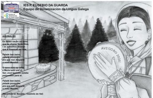 O IES Plurilingüe Eusebio da Guarda felicítanos as festas con este aguinaldo recollido en Nocelo (Castrelo de Val) e incluído no Cancioneiro gallego de Eduardo Martínez Torner e Jesús Val y Gay. A escolla da composición popular para esta postal supón tamén un recoñecemento a todas as persoas que nos transmitiron a poesía de tradición oral, a quen a RAG homenaxeará o Día das Letras Galegas 2025. Felices festas e parabéns a Carolina polo seu traballo!