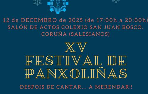 O CPR San Xoán Bosco (Salesianos) da Coruña acollerá o vindeiro 12 de decembro, de 17.00 a 20.00 h, o XV Festival de Panxoliñas. Unha iniciativa promovida por Escolas Católicas de Galicia co apoio da Secretaría Xeral da Lingua e outras entidades para fomentar os cantos de Nadal en galego.