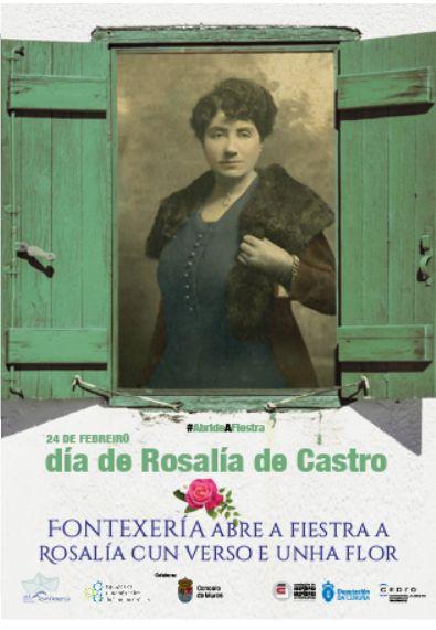 Díptico Fontexería abre a fiestra a Rosalía cun verso e unha flor JPG