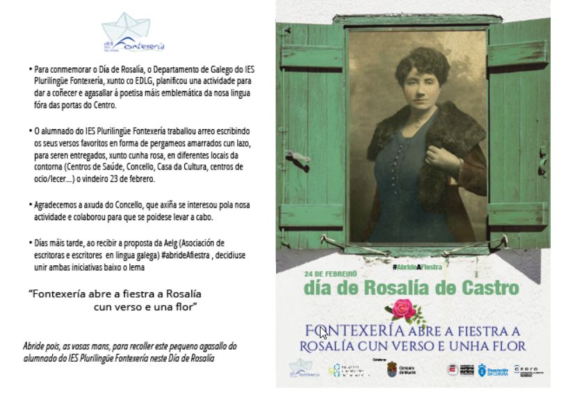 O IES Fontexería celebra o Día de Rosalía co agasallo de flores e de pergameos cos versos rosalianos preferidos do alumnado en centros de saúde, Casa do Concello, Casa da Cultura... ao longo do 23 de febreiro, véspera do Día de Rosalía.