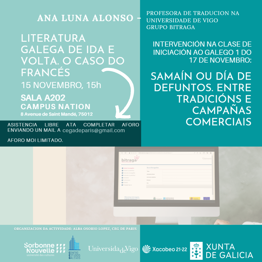 Actividade do CEG de París. Intervención de Ana Luna Alonso (profesora de tradución na Uvigo), na Sorbonne Nouvelle, na clase de Initiation au galicien niveau 1. A noite do 31 de outubro ao 1 de novembro ten elementos en común con outras noites na que en diferentes espazos do mundo as e os defuntos e os espíritos do alén andan de visita. Como se lle debe chamar? Halloween, Samaín, Defuntos ou Noite dos mortos?