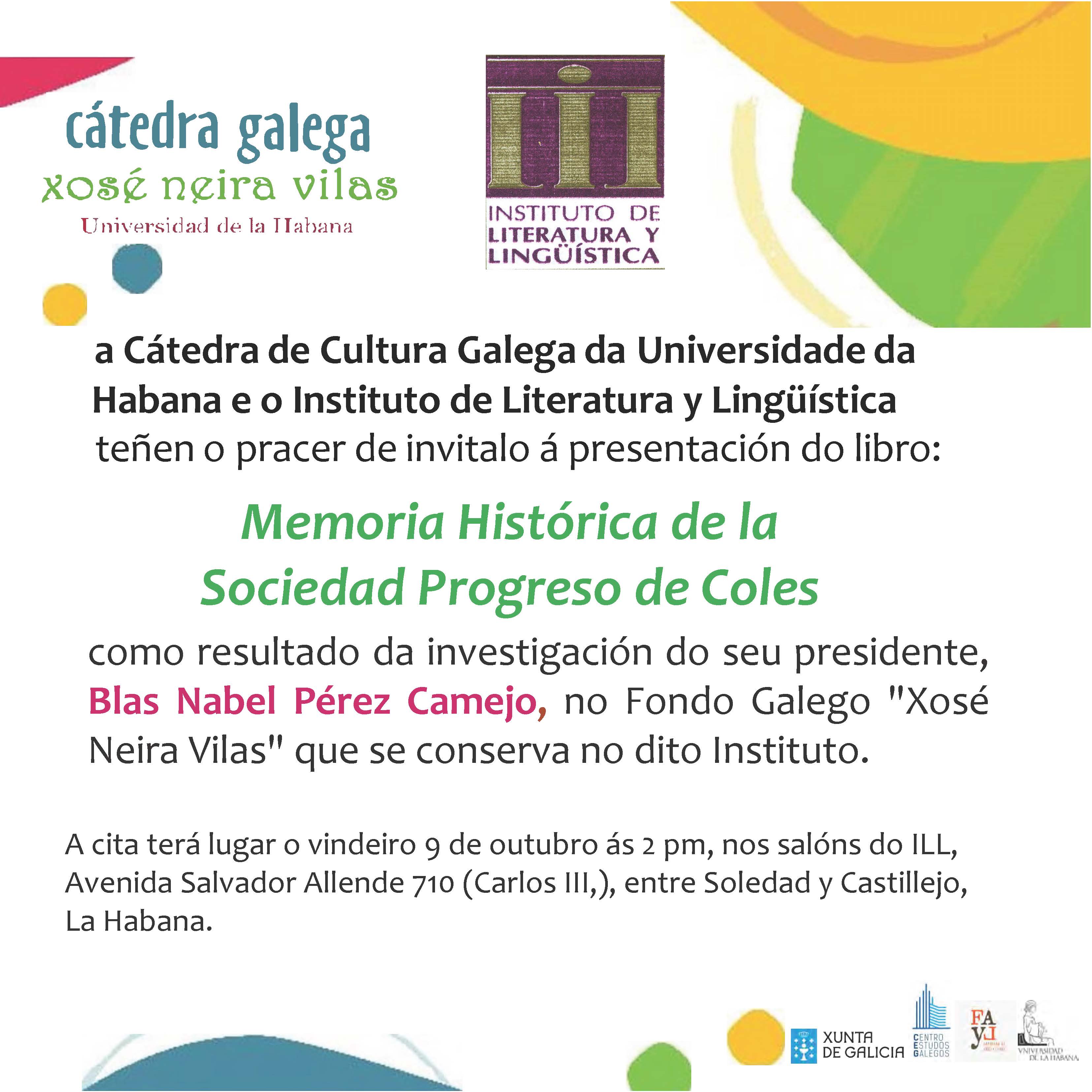 Actividade da Cátedra de Cultura Galega da Universidade da Habana. Presentación do libro ‘Memoria Histórica de la Sociedad Progreso de Coles’, como resultado da investigación do seu presidente, Blas Nabel Pérez Camejo, no Fondo Galego “Xosé Neira Vilas” que se conserva do Instituto de Literatura e Lingüística.