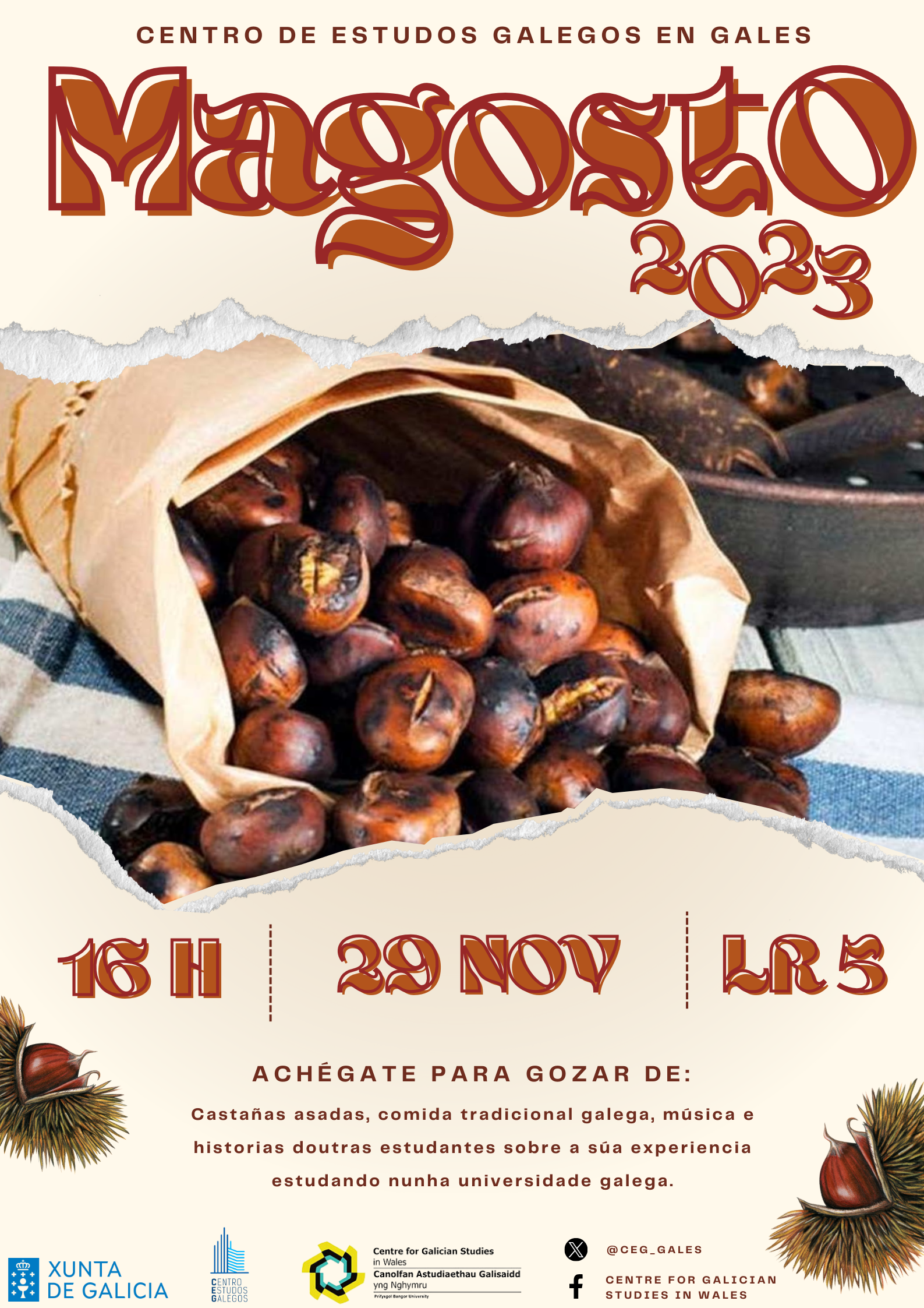 Actividade do Centro de Estudos Galegos en Gales. Castañas asadas, comida tradicional galega, música e historias de estudantes sobre a súa experiencia estudando nunha universidade galega.