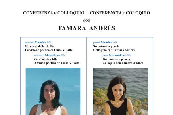 Actividade do CEG de Padua. O mércores 23 e o xoves 24 de outubro, o Centro de Estudos Galegos de Padua organiza dúas conferencias vía Zoom coa poeta Tamara Andrés (ás 18:00 hora galega).