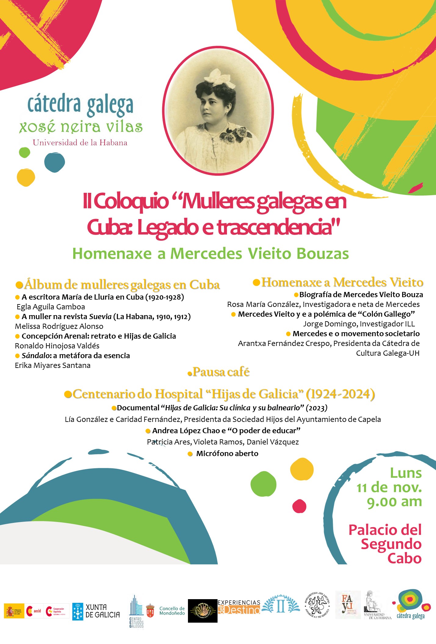 Este ano 2024, co gallo do centenario do hospital “Concepción Arenal” da Sociedade “Hijas de Galicia”, o 12 de outubro de 1924, e do 150 aniversario do natalicio de Andrea López Chao, dirixente desa institución, a Cátedra de Lingua e Cultura Galegas da Universidade da Habana presenta o coloquio ‘Mulleres galegas en Cuba. Legado e transcendencia’.