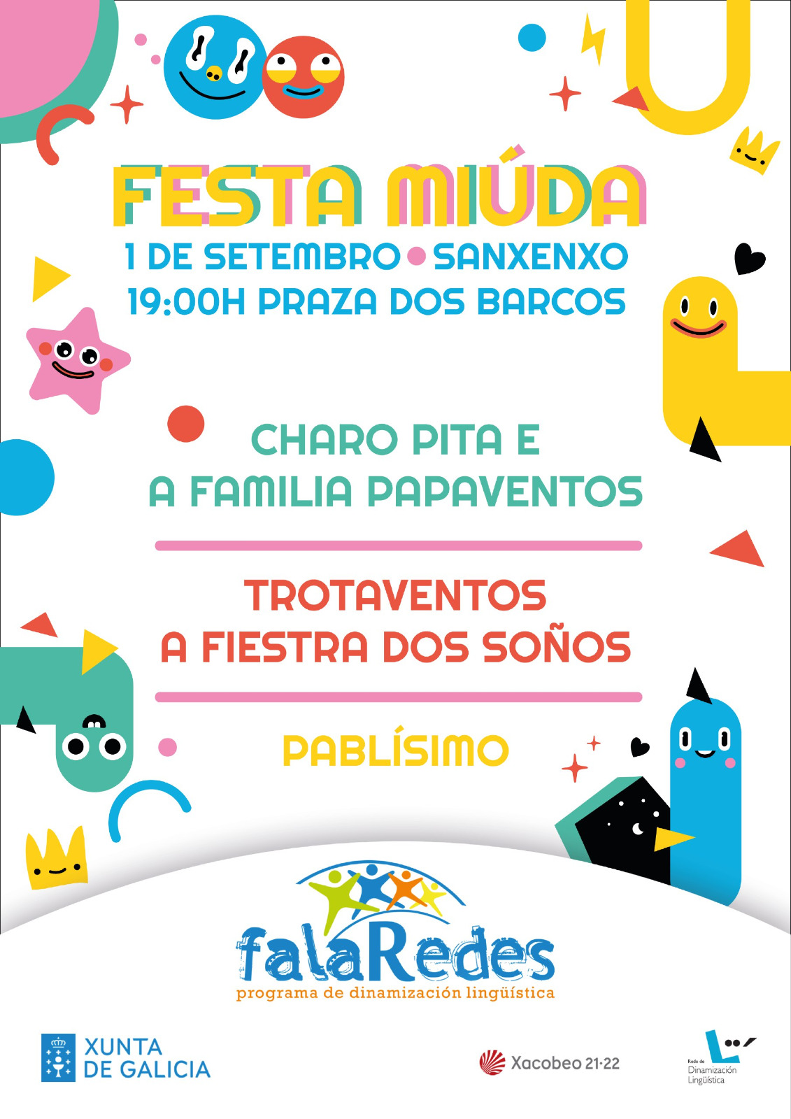 "Festa miúda" é unha xornada de celebración con música e teatro para o público infantil e familiar. Un espazo festivo onde compartir, escoitar e divertirse en galego. Unha tarde enteira para cantar, contar e bailar con Charo Pita coa súa “Familia Papaventos”, a quen seguirá a “A fiestra dos soños” de Trotaventos e, para pechar, os contos, historias e monicreques de Pablo Sánchez, Pablísimo.
