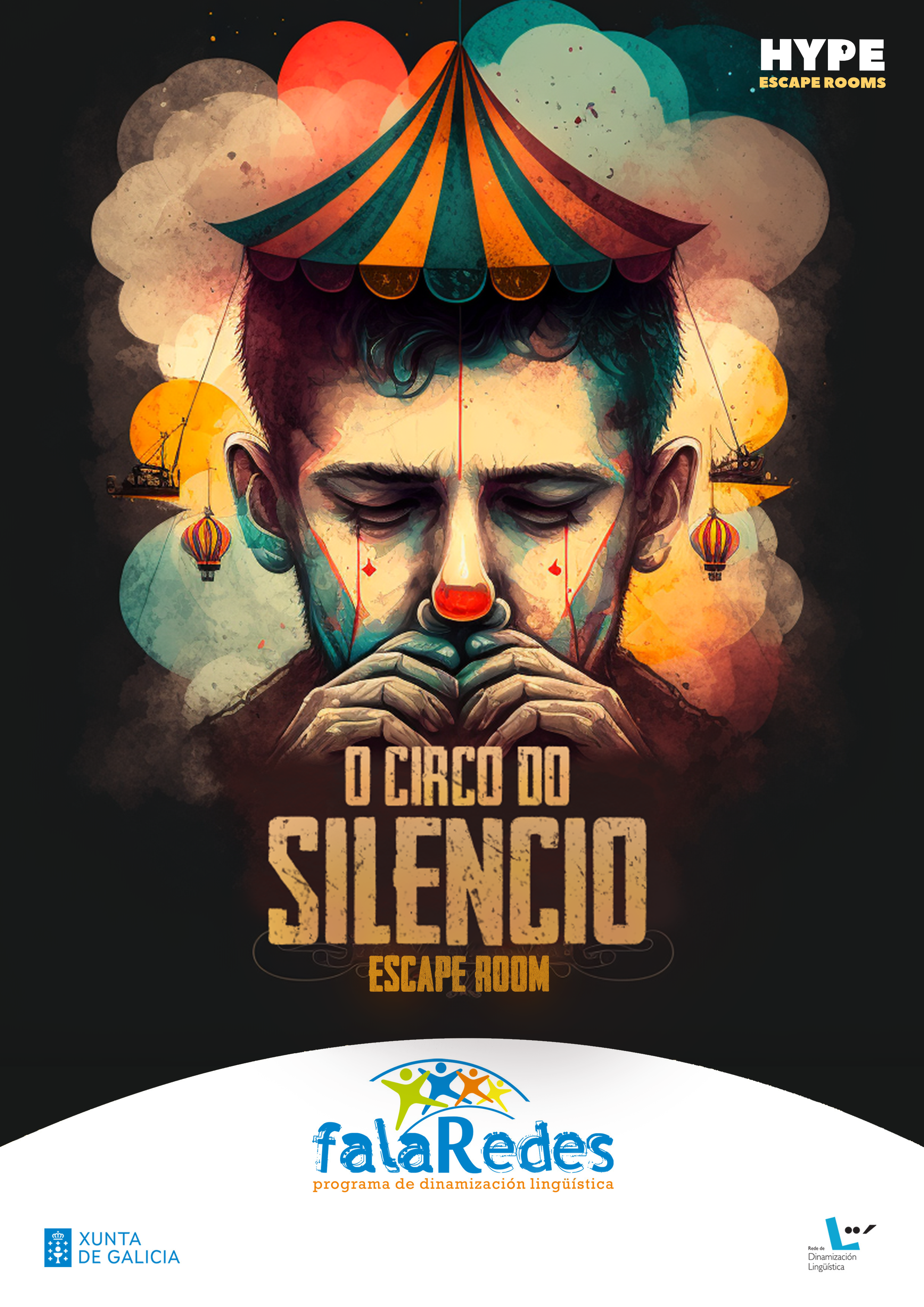 A sala de fuxida ou scape room O circo do silencio vaise desenvolver en 10 concellos da Rede de Dinamización Lingüística en sesións sucesivas de 30 minutos ao longo dunha xornada (desde as 11:00 h ata as 21:00 h), nunha pequena carpa circense instalada na rúa. Está pensada para catro xogadores en cada quenda, que terán que resolver en equipo unha serie de enigmas para completaren a misión final.