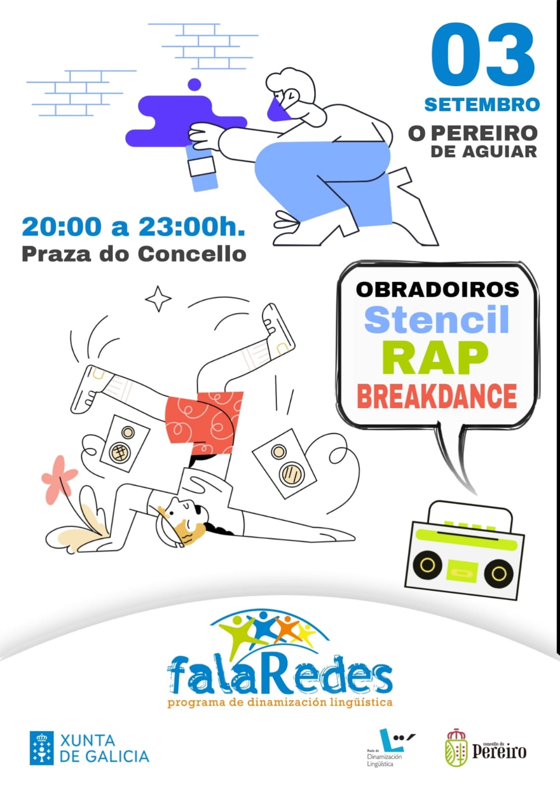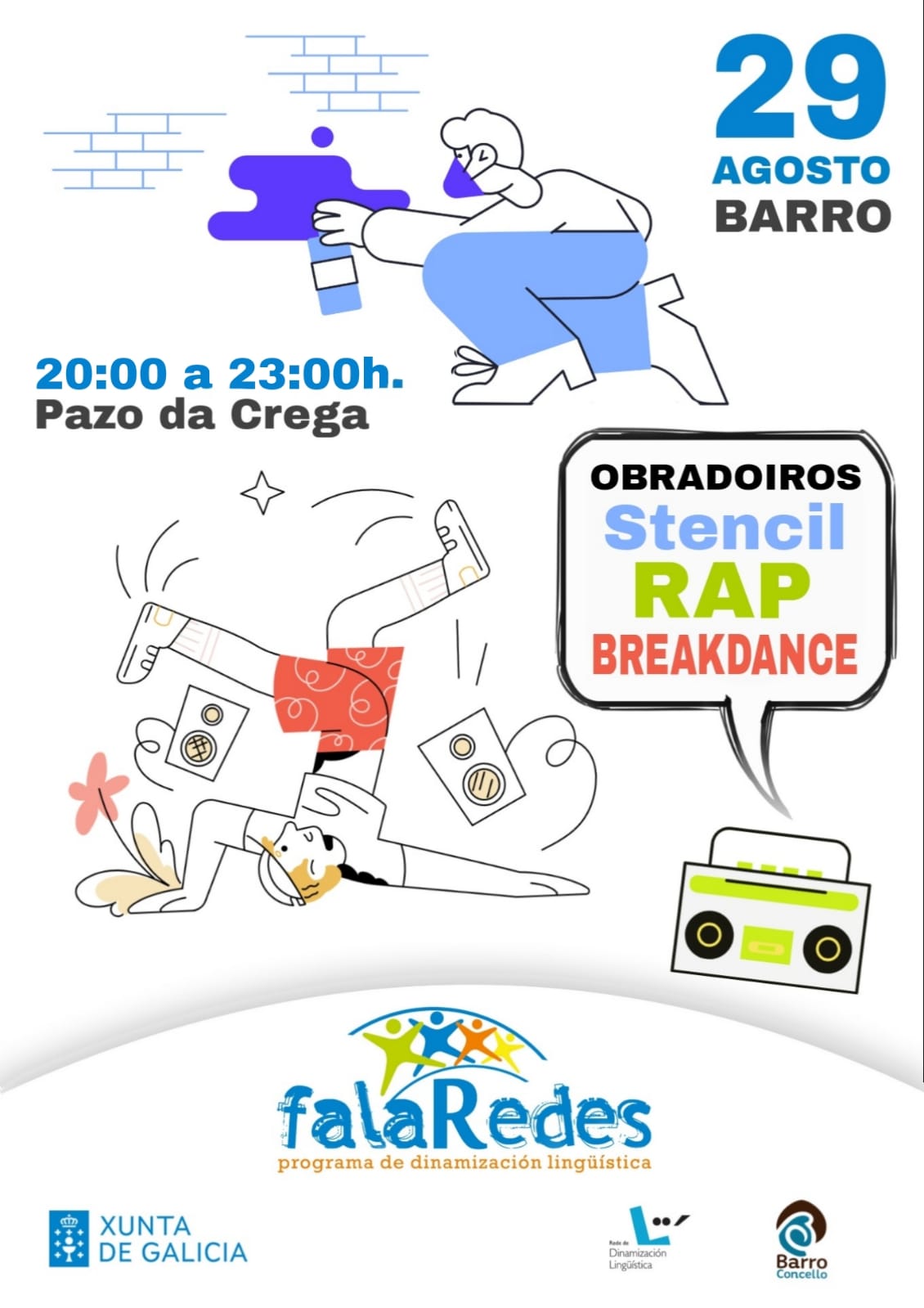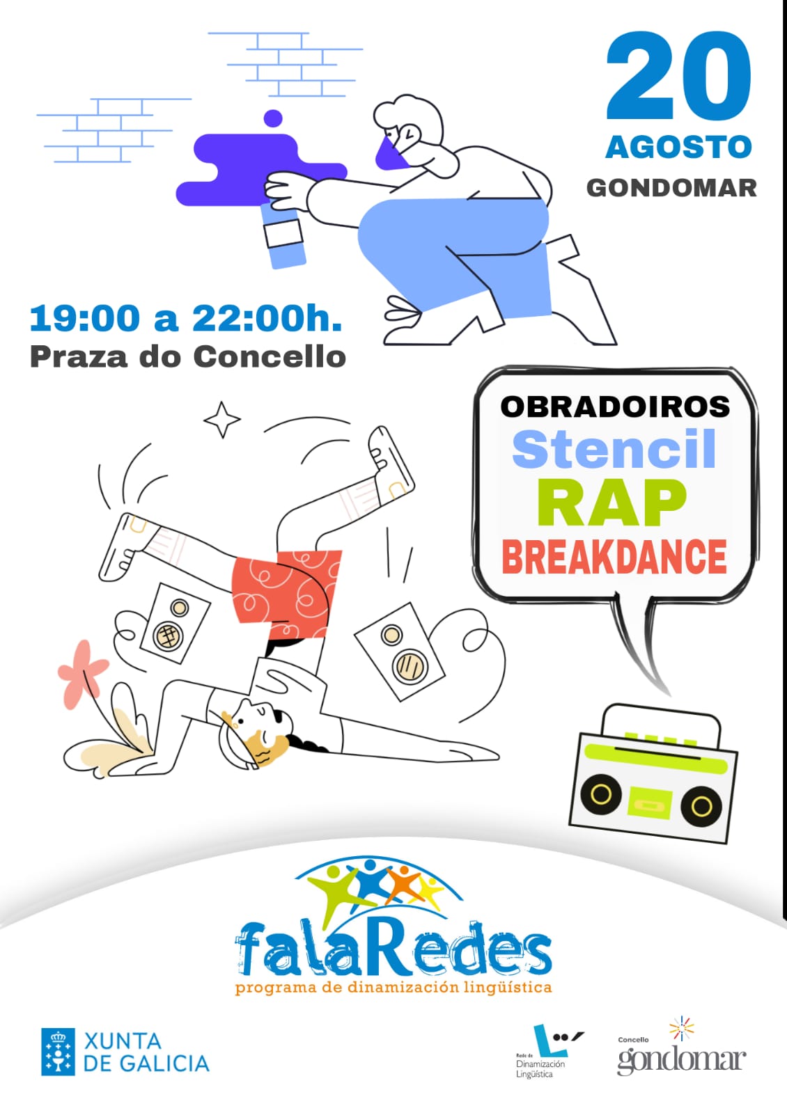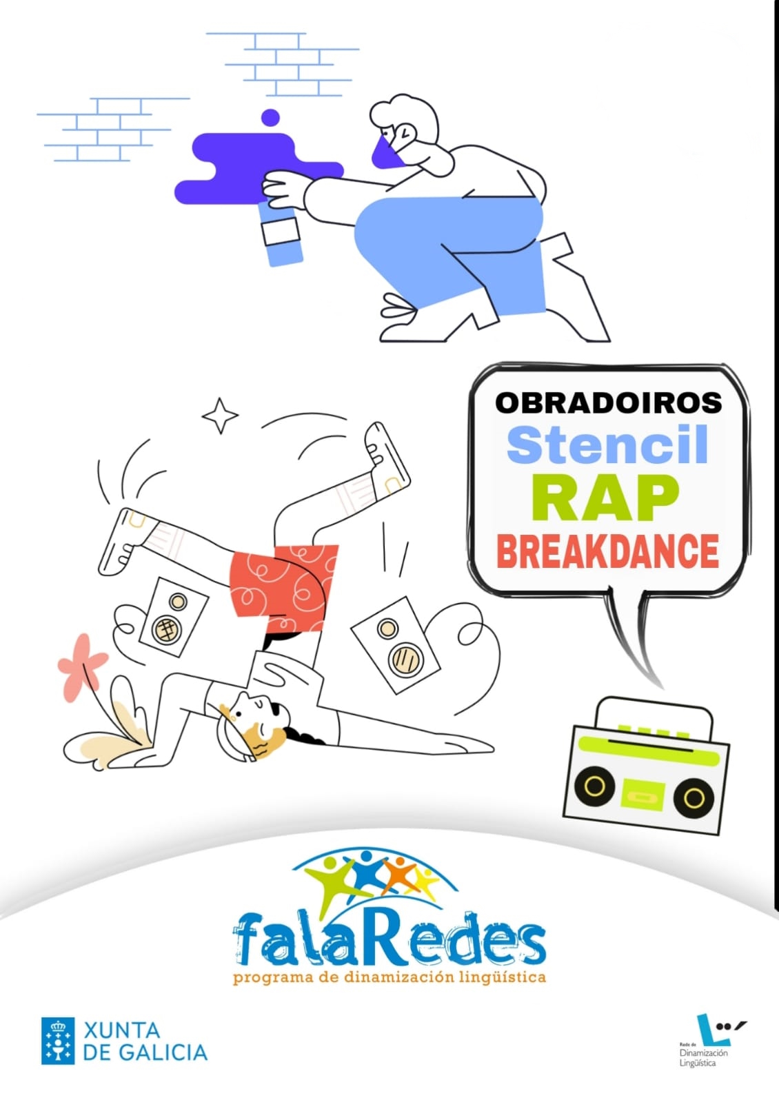 As actividades do programa de dinamización do uso da lingua galega FalaRedes continúan cos obradoiros de rap, breakdance e estampado de camisetas. Co galego sempre como lingua vehicular, a mocidade (e quen sexa maior tamén, por suposto) gozará da aprendizaxe das expresións artísticas e deportivas da cultura urbana do máis alto nivel.