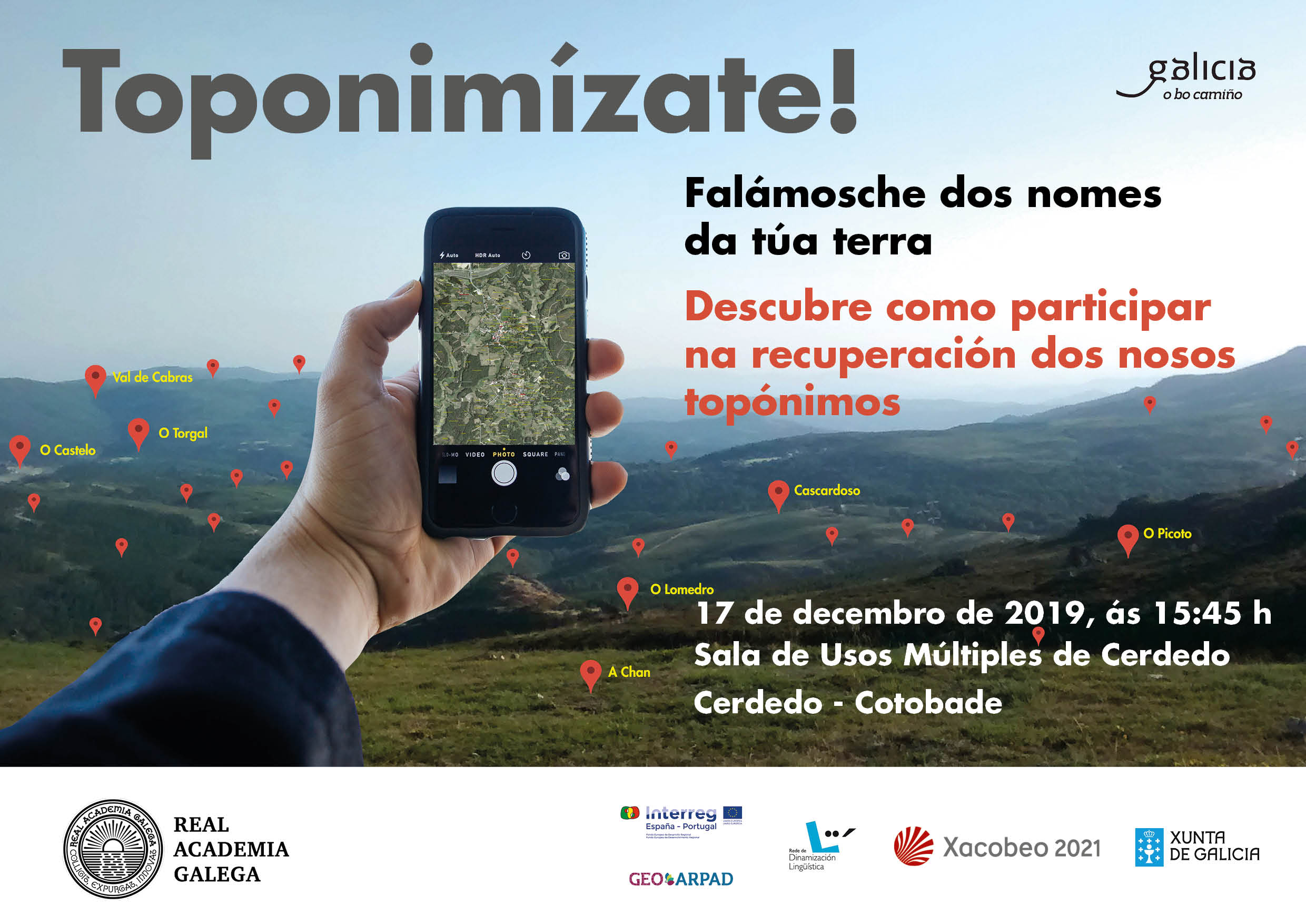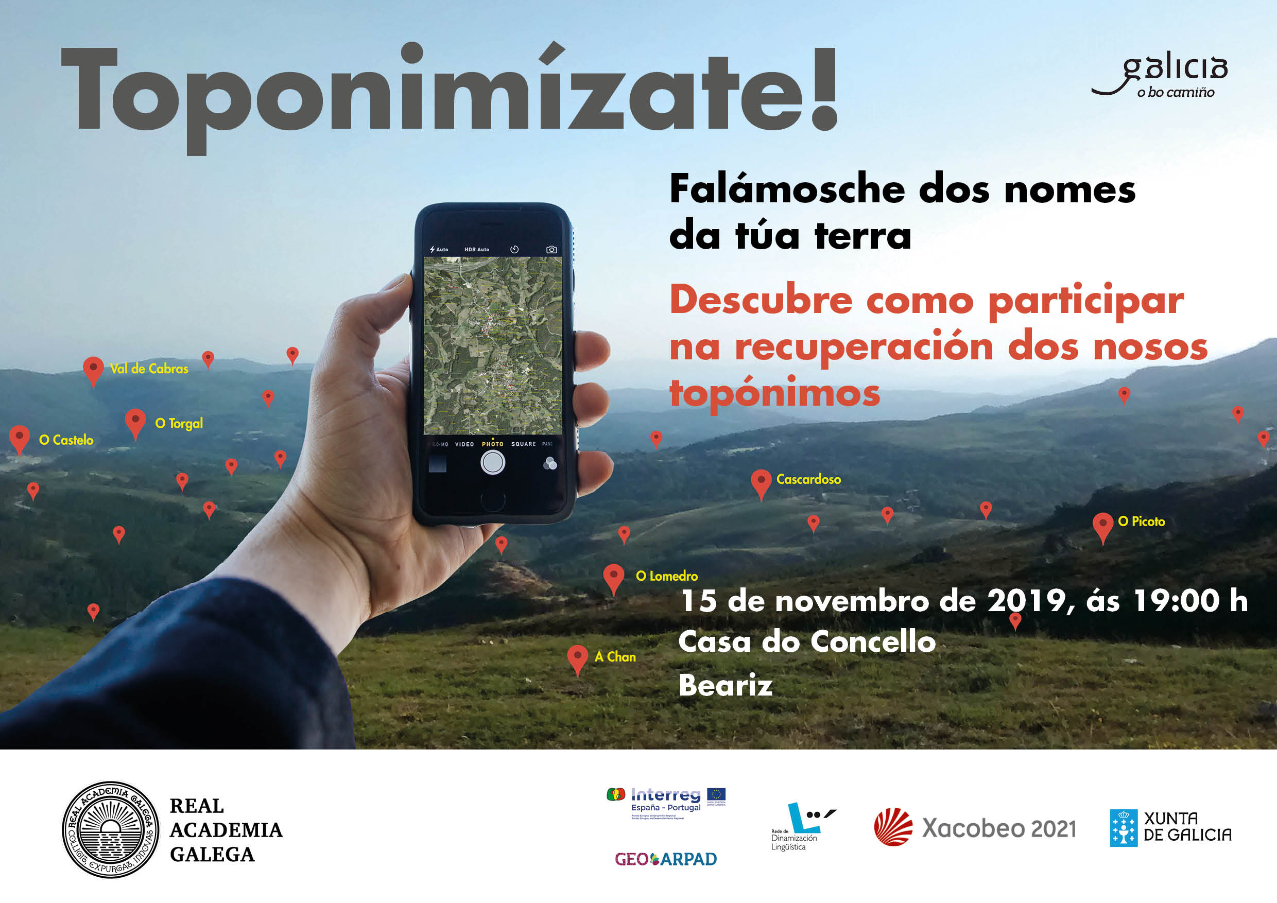 Ponse en marcha un ano máis o programa de promoción da lingua galega Toponimízate. Falámosche dos nomes da túa terra. A acción enmárcase nos proxectos Toponimia de Galicia e GeoArpad, impulsados ambos os dous desde a Xunta de Galicia, e coordinarase desde a Real Academia Galega (RAG) en colaboración coa Secretaría Xeral de Política Lingüística.