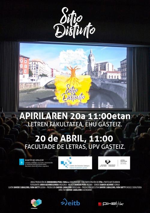 O Lectorado de Galego da UPV (Vitoria-Gasteiz) participa no Ciclo de cinema organizado anualmente por estas datas polos lectorados da institución. Por parte do Lectorado de Galego, nesta edición proxectarase o documental "Sitio Distinto". Contarán coa presenza do director Davide Cabaleiro, quen participará nun coloquio arredor deste filme sobre a relación entre Galicia e Euskadi.