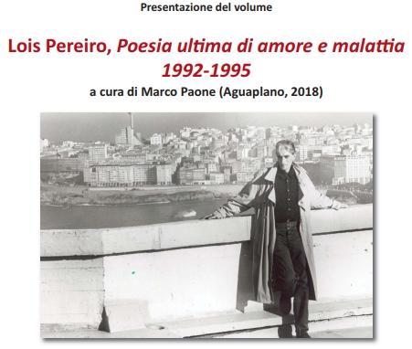 O día 27 de abril terá lugar a presentación en Padova da tradución do libro de Lois Pereiro ‘Poesía última de amor e enfermidade’. ‘Lois Pereiro, Poesia ultima di amore e malattia 1992‐1995’ (Aguaplano, 2018), será presentado polo editor Marco Paone. Conversará co editor o director do Centro di Studi Galeghi dell’Università di Padova, Giovanni Borriero.