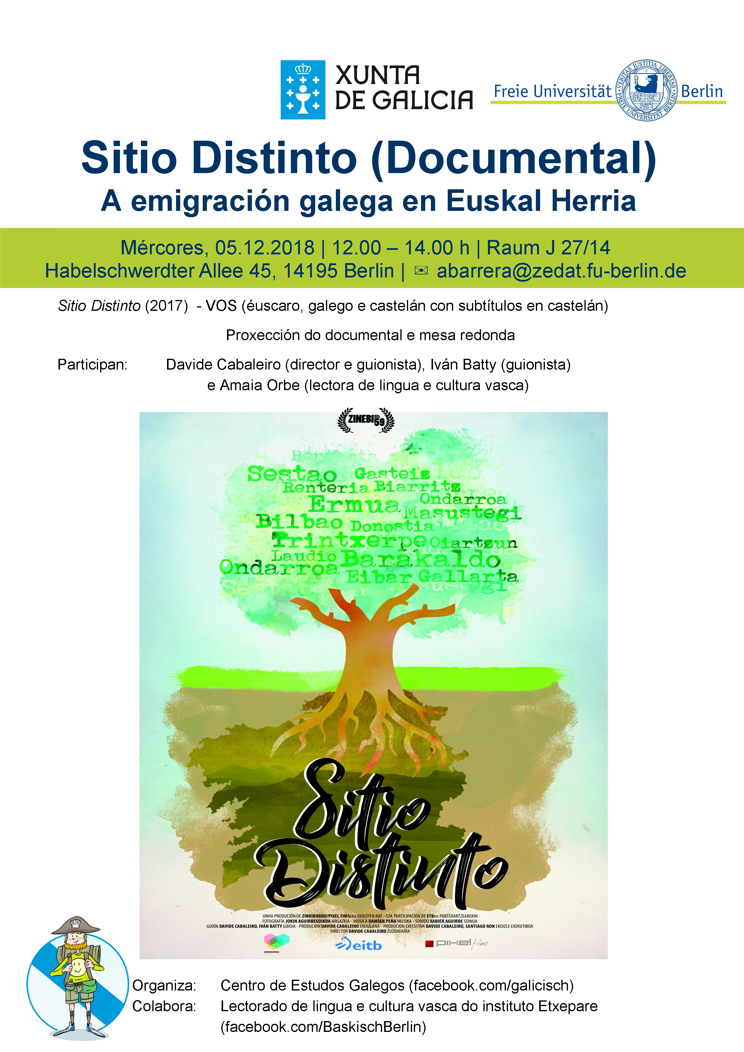 O documental Sitio Distinto viaxa ata Berlín co Centro de Estudos Galegos. O filme proxectarase na universidade berlinesa Freie Universität coa presenza de Davide Cabaleiro (director e guionista) e Iván Batty (guionista). Despois da proxección iniciarase un pequeno debate no que os asistentes poderán falar cos convidados sobre a longametraxe e a situación que nela se reflicte.