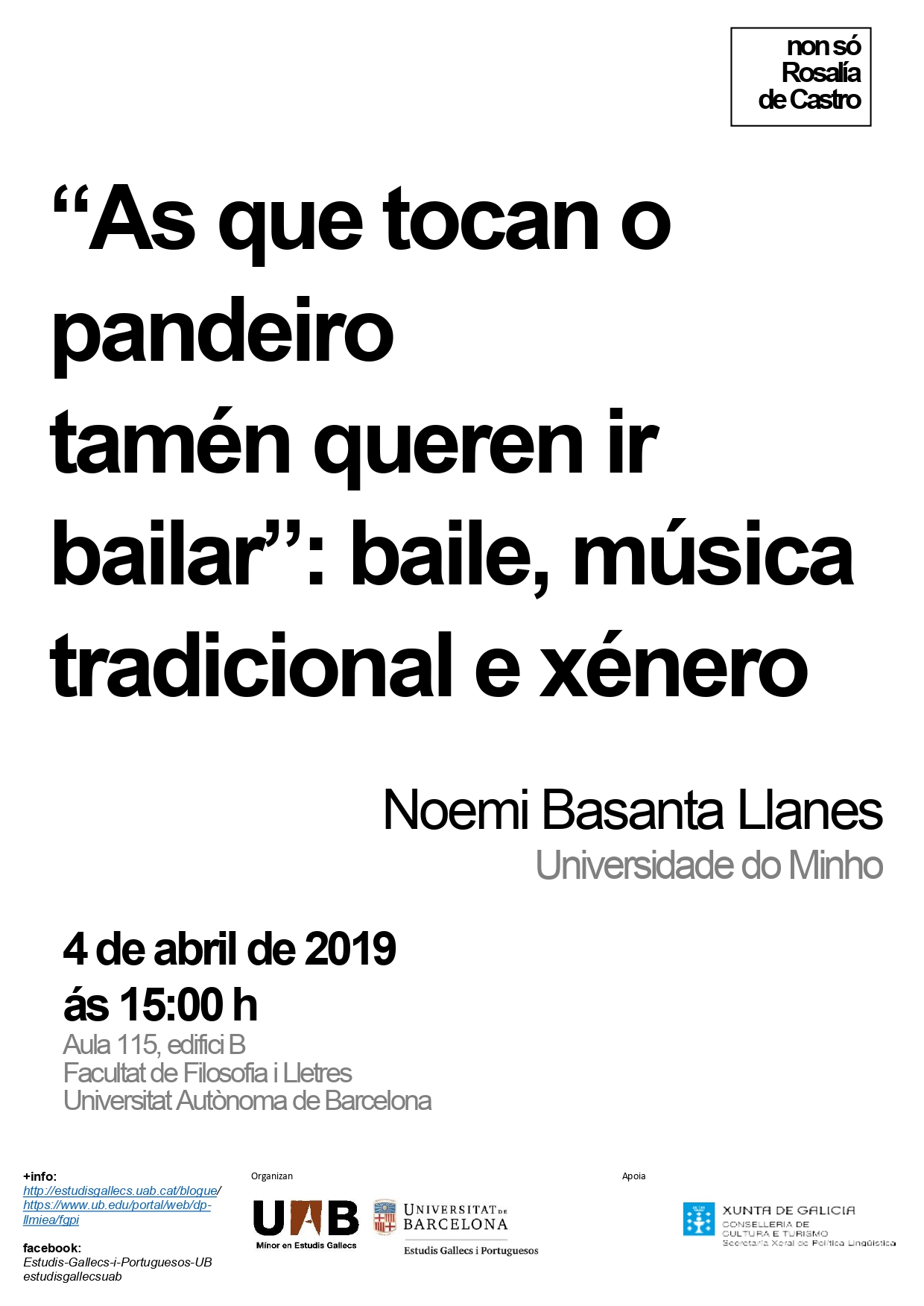 O Centro de Estudos Galegos da Universidade Autónoma de Barcelona organiza a conferencia "As que tocan o pandeiro tamén queren ir bailar: baile, música tradicional e xénero” a cargo de Noemi Basanta Llanes, profesora lectora da Universidade do Minho.