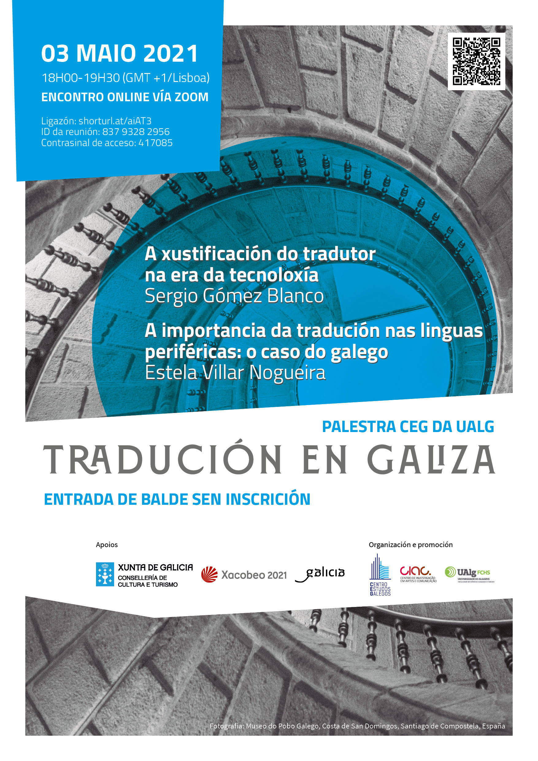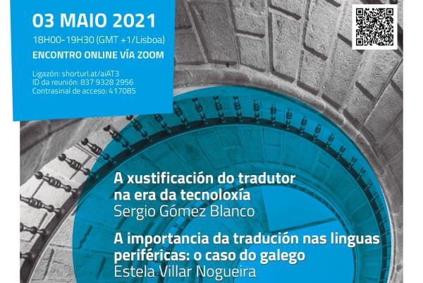 Tradución en Galiza é o evento anunciado polo Centro de Estudos Galegos do Algarve para este luns 3 de maio de 2021, a partir das 18:00 horas. Incluirá dúas conferencias en liña: "A xustificación do tradutor na era da tecnoloxía" e "A importancia da tradución nas linguas periféricas. O caso do galego". Estas palestras forman parte da mesa redonda À(a) conversa, que se desenvolverá entre os meses de maio e decembro e na que contarán con conferencias de distintos especialistas nas áreas da tradución, a edición e a normalización lingüística.