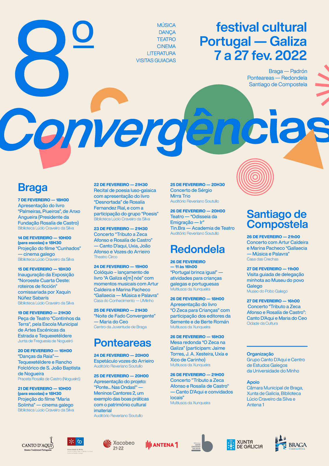 O Centro de Estudos Galegos da Universidade do Minho (Portugal) e o grupo musical Canto d'Aquí organizan un ano máis estas converxencias destinadas a estreitar os lazos culturais entre as comunidades galega e portuguesa a través da unión entre voces e músicas, danza, teatro, cinema, coloquios, faladoiros e poesía.