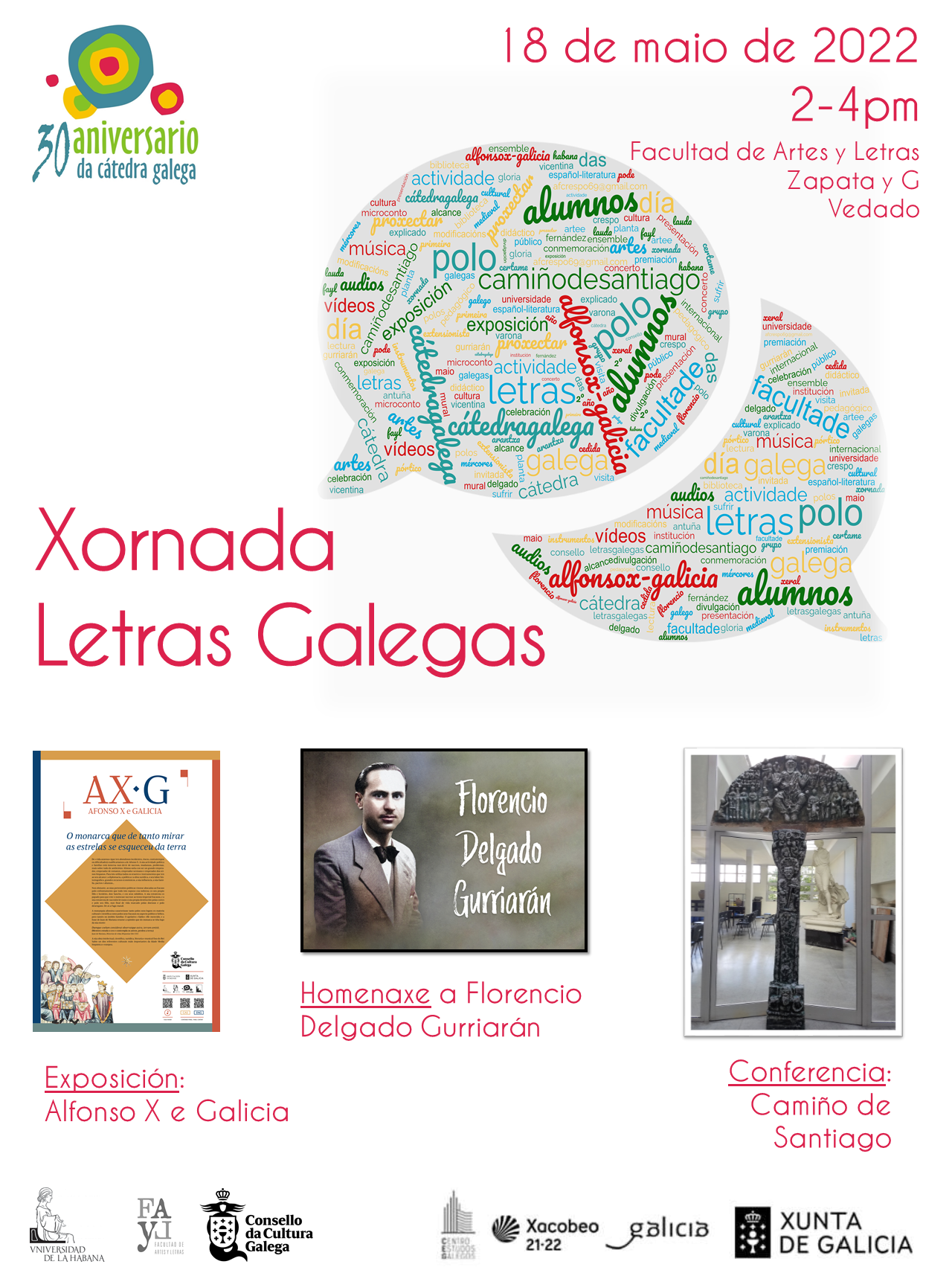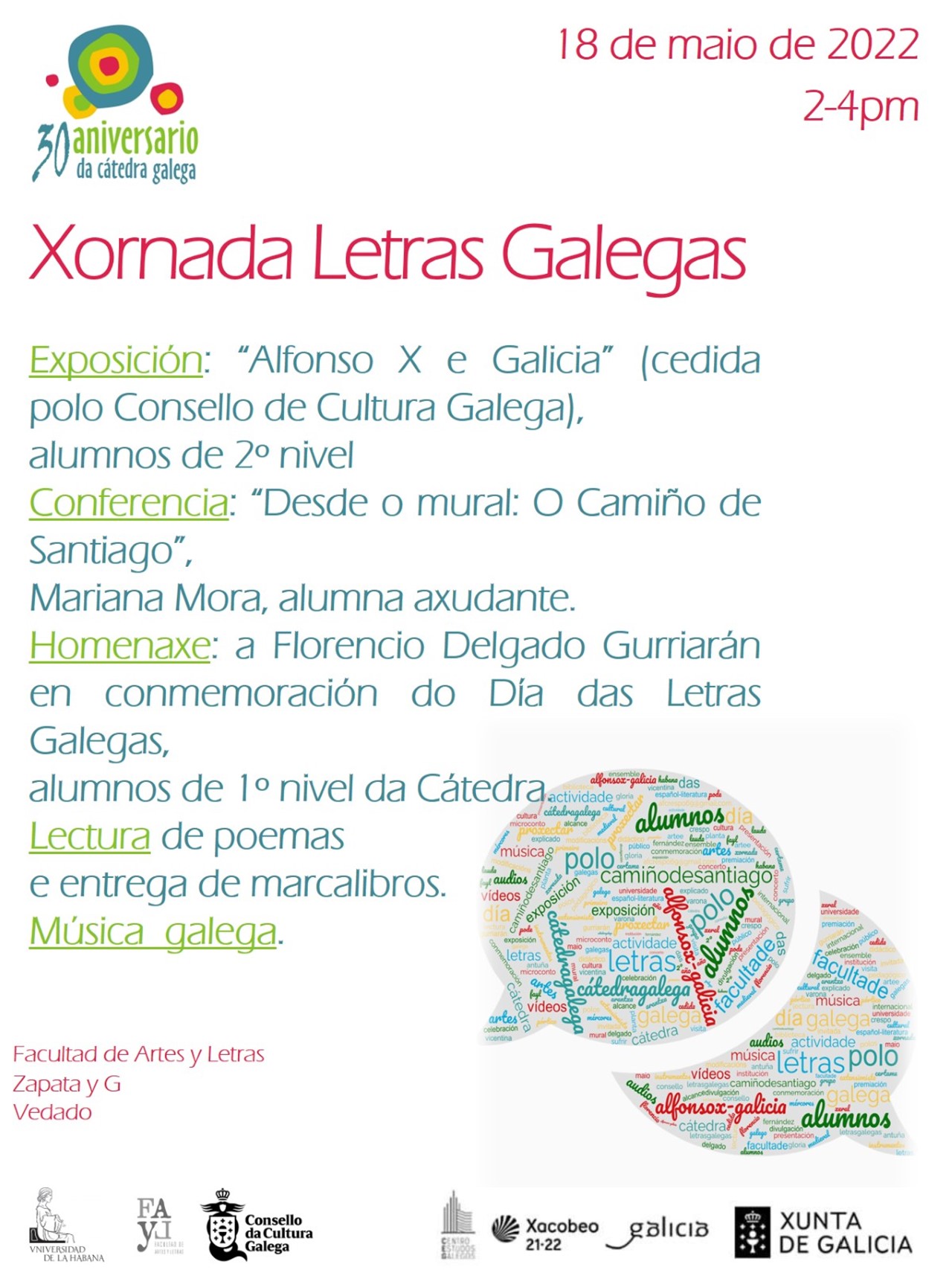 Actividade do CEG da Universidade da Habana. A Facultade de Artes e Letras da Universidade da Habana organiza un programa de actividades coincidindo coa semana das Letras Galegas 2022. Será o mércores 18 de maio, de 2 a 4 pm, organizada pola Cátedra de Cultura Galega, no marco do 30 aniversario da súa creación.