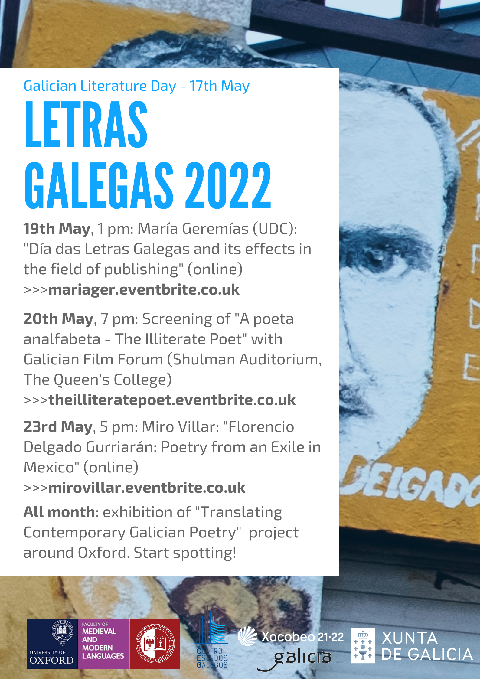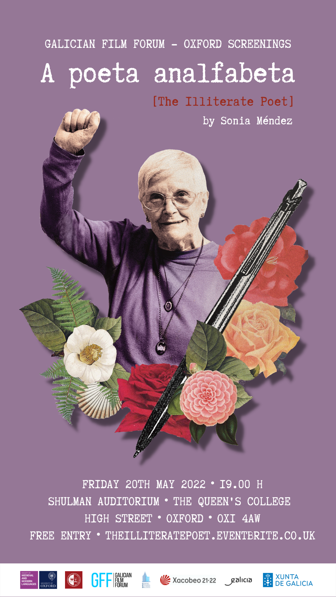 - 20 de maio, 19:00 (Reino Unido): proxección do documental A poeta analfabeta de Sonia Méndez, en colaboración co Galician Film Forum. O acto terá lugar en persoa no Shulman Auditorium do Queen's College.