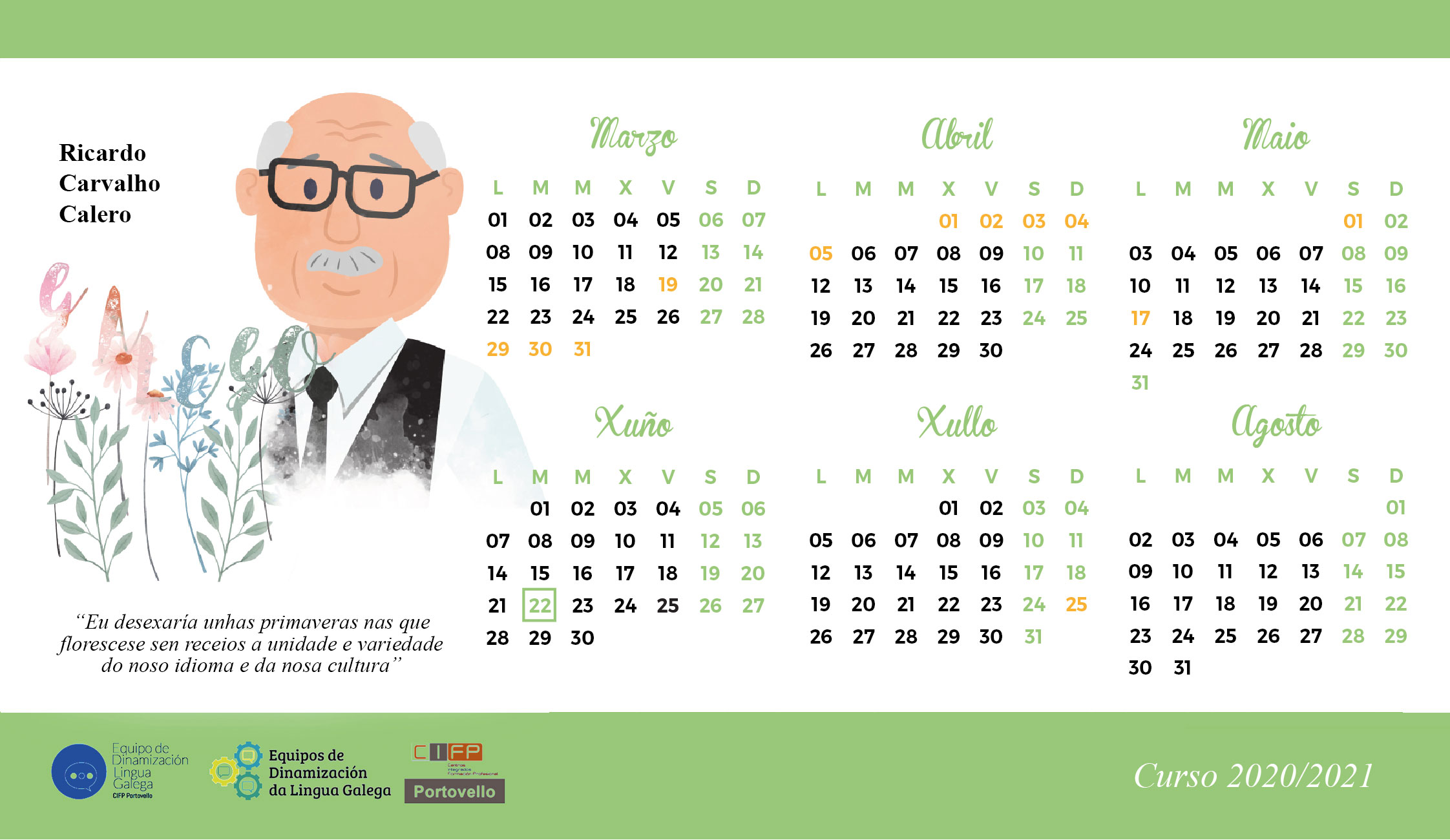 Velaquí, un ano máis, o calendario de mesa que nos achegan desde o CIFP Portovello de Ourense e que desta volta ilustraron con imaxes e versos de Ricardo Carvalho Calero.