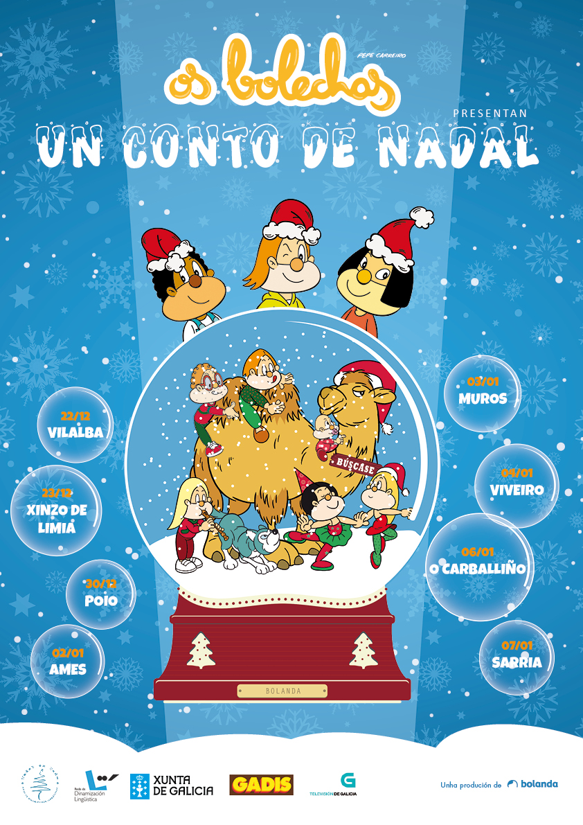 Desde hai 7 anos, Os Bolechas percorren Galicia grazas á colaboración de Gadis, a Televisión de Galicia e a Secretaría Xeral de Política Lingüística. Este ano fano coa proposta Un conto de Nadal, unha peza teatral con actores e cos muppets da Televisión de Galicia. A historia xira en torno a unha broma que lle fan Kofi e Sarela aos Bolechas sobre a desaparición dun camelo cargado de xoguetes que porá en perigo a noite de Reis, a máis máxica do ano para a cativada. Braulio decide crear unha máquina que recupere o camelo pero algo sae mal e os que van aparecendo son Papá Noel, o Apalpador e moitos outros personaxes ligados ás festas do Nadal que farán as delicias do público.