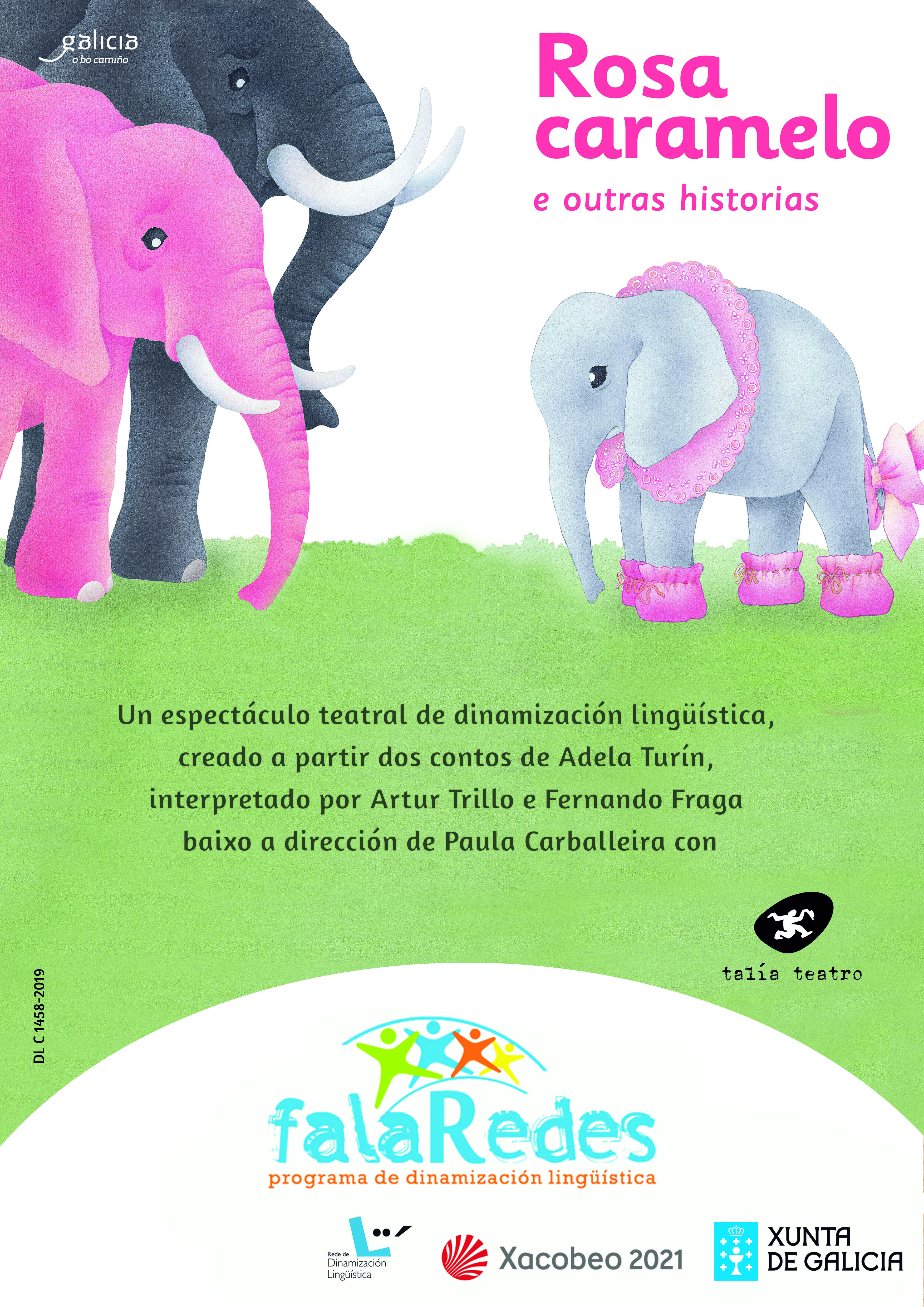 Illada nun xardín, Margarida é a única elefanta do grupo que non consegue que a súa pel sexa de cor rosa caramelo... Cando seus pais desisten desa idea, descubrirá o significado da liberdade e abriralles o camiño da igualdade ás súas compañeiras. Rosa caramelo e outras historias é un espectáculo teatral de dinamización lingüística creado a partir dos contos de Adela Turín que lles dá a volta a roles e estereotipos de xénero. Rosa caramelo, A historia dos bonobos con lentes, Unha feliz catástrofe e Artur e Clementina combinan a palabra coa música en directo, para crear unha atmosfera adecuada coa que desmontar prexuízos sobre actitudes e aptitudes de mulleres e homes.