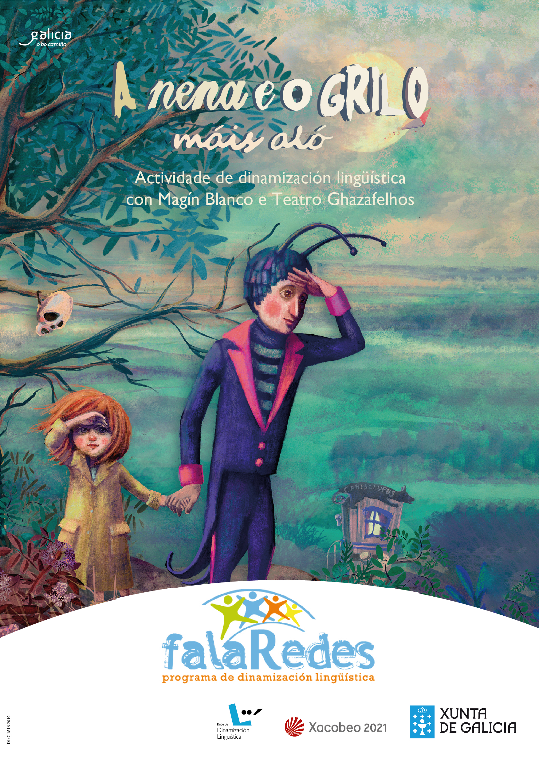 Á oitava edición do programa que a Secretaría Xeral de Política Lingüística leva a concellos da Rede de Dinamización Lingüística (RDL) súmase A nena e o grilo máis aló, unha proposta teatral e musical de dinamización lingüística para toda a familia que chegará no outono da man de Magín Blanco e Teatro Ghazafellos (Montse Piñón, Pepablo Patiño e Jorge Casas), con música en directo de Cristian Leggiero, a dez concellos galegos.