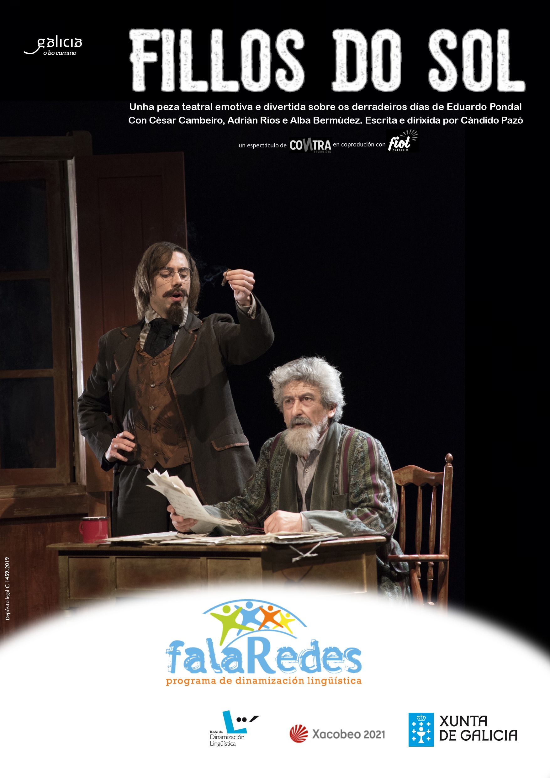 Fillos do sol é unha peza teatral emotiva e divertida sobre os derradeiros anos de Eduardo Pondal, escrita e dirixida por Cándido Pazó, con César Cambeiro, Adrián Ríos e Alba Bermúdez. A peza, a cabalo entre a realidade ficcionada e a fabulación dramática, presenta o personaxe desdobrado nun DON EDUARDO, xa octoxenario e comesto pola neurose dos seus últimos anos, confronta as súas dúbidas, medos e insatisfaccións creativas cun personaxe nacido da súa perturbación: EDUARDO, que non é outro ca el mesmo, de mozo, nos inicios da súa carreira literaria. E, como contrapunto, a vida real e diaria representada por ROSA, a criada nova da pensión na que o bardo pasou a derradeira etapa da súa vida.
