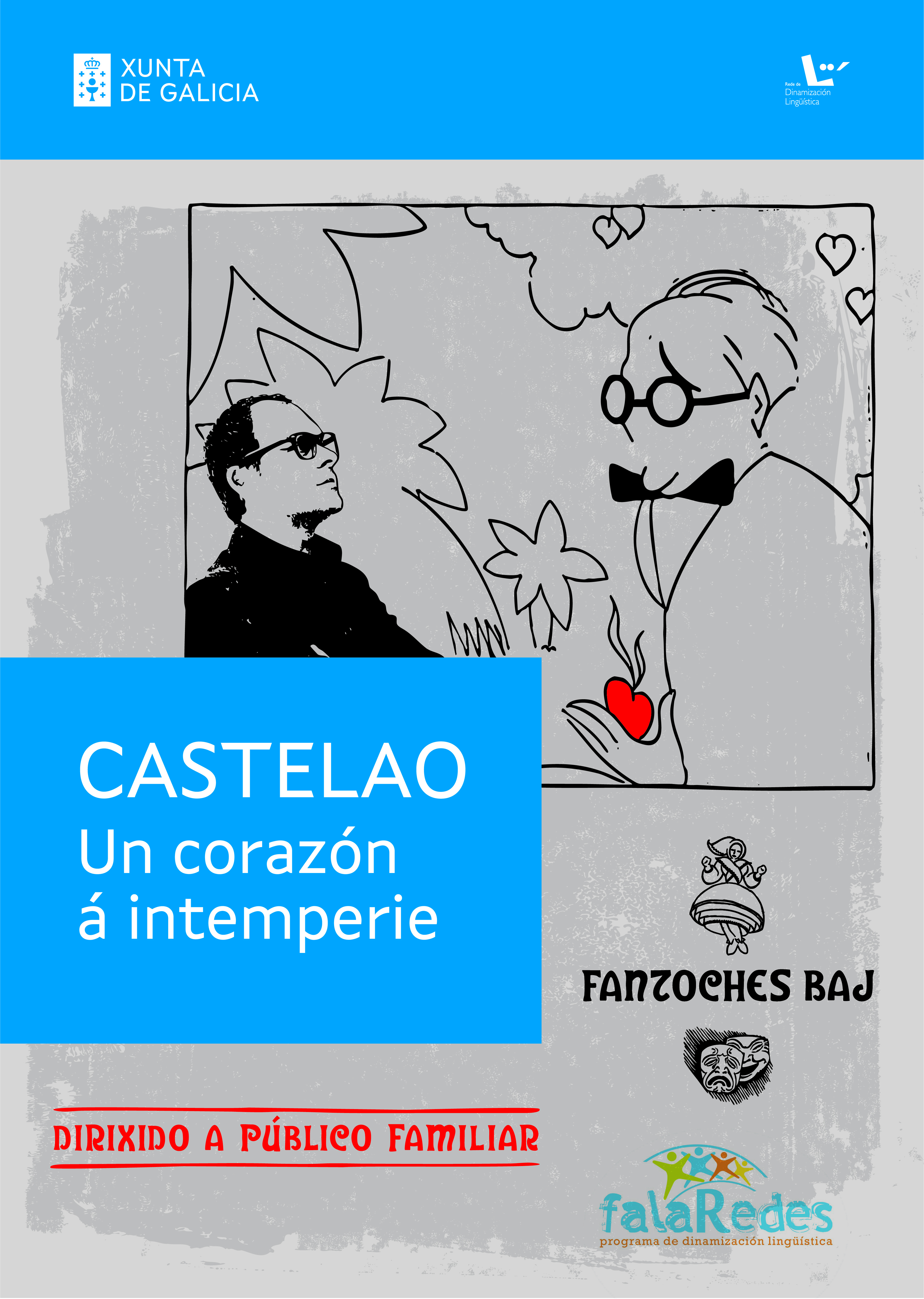 Velaquí a primeira, que nos chega da man da compañía Fantoches Baj. Trátase dunha peza de teatro dirixida a nenos e nenas a partir dos 6 anos e mais ás súas familias. Nela veremos a Varela Buxán -dramaturgo e director de escena que no seu día dirixiu a estrea d’Os vellos non deben de namorarse- renderlle a súa particular homenaxe a Castelao. Nun pequeno escenario, vai narrar as vicisitudes da súa vida e vai representar algúns dos seus fitos literarios apoiándose en diferentes técnicas escénicas. Deste xeito “O pai de Migueliño” contarao con viñetas a modo do Kamishibai, “Peito de Lobo” representarao usando un cabezudo, para o primeiro cadro do segundo lance d’ Os vellos non deben de namorarse empregará monicreques e para o monologo d’ Un ollo de vidro valerase da técnica do teatro de máscaras.