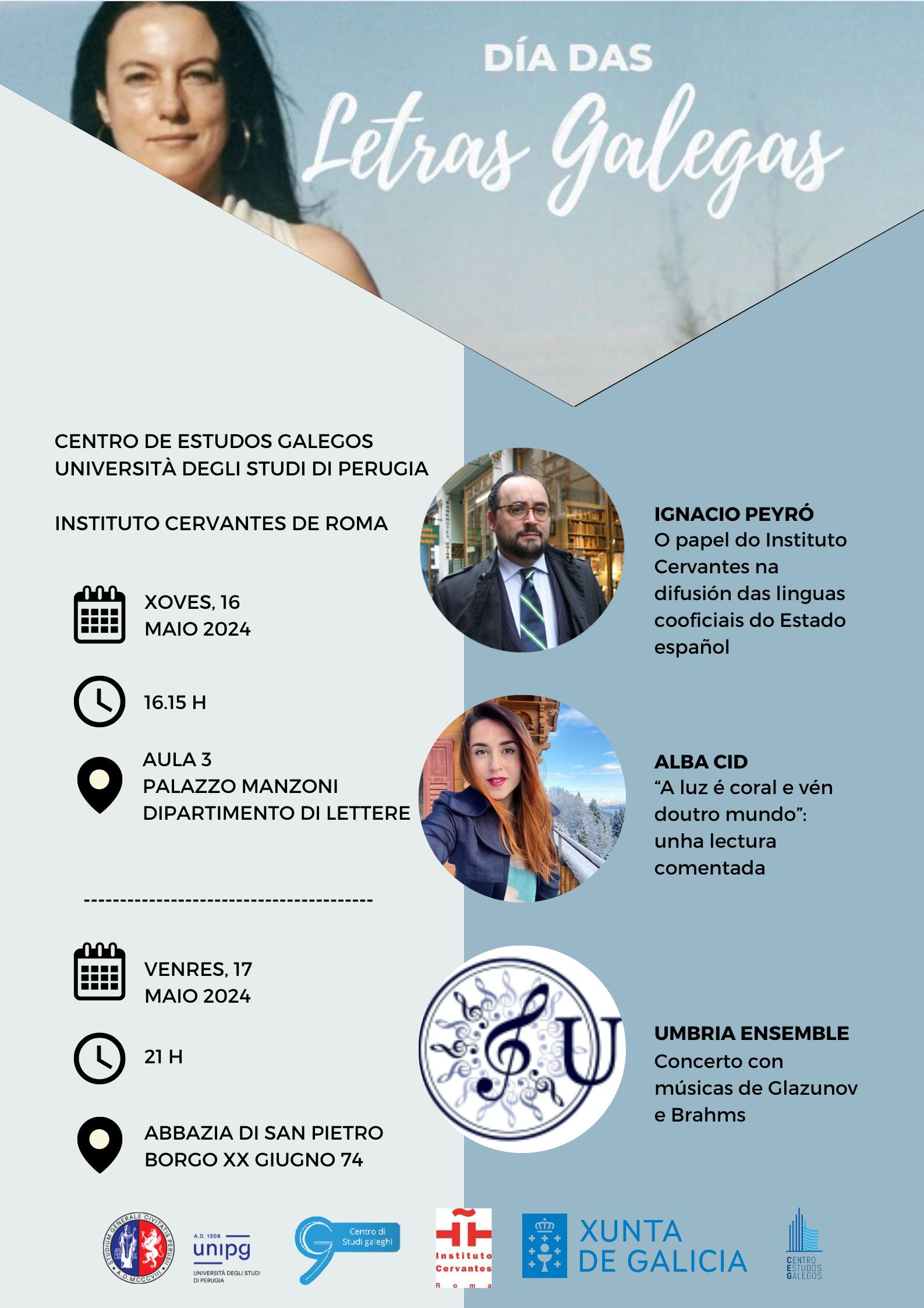 Para celebrar o Día das Letras Galegas, o Centro di Studi Galeghi dell’Università di Perugia, en colaboración co Instituto Cervantes de Roma, organizou os días 16 e 17 de maio as seguintes iniciativas.