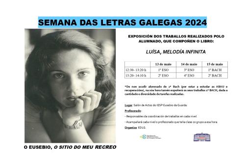 Presentación dos traballos de investigación incluídos no libro Luísa, melodía infinda que realizou o alumnado do IES Plurilingüe Eusebio da Guarda como tributo á súa antiga alumna. Ademais de abordar distintos aspectos da obra da poeta, narradora, articulista, dramaturga e ensaísta, tampouco se esqueceu a tradución. En homenaxe a esta faceta da autora tamén podemos escoitar os seus versos en latín, grego, inglés e francés.
